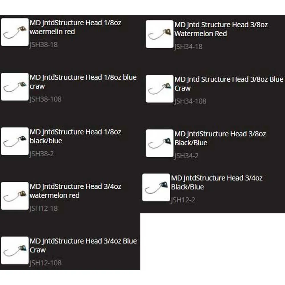 Strike King® Jointed Structure Head kombinerer den populære ´´svingende hode´´-stilen med de enestående egenskapene til Strike King´s Structure Jig. Structure Head er utviklet med assistanse av Bassmaster Classic® Champion Mark Davis, og er allsidig i sin applikasjon og perfekt i sin design. Hodedesignet lar sportsfiskere holde maksimal kontakt med bunnen, men den er super ugressfri! Davis sier: ''Kroken er også akkurat passe for rigging og like god til å holde store fisker med knapper.''