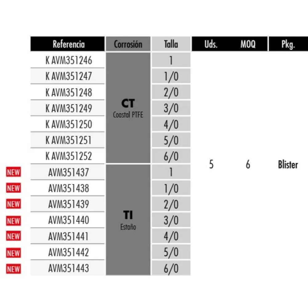 Vanadium® stål, Technical Locking Curve form og Coastal PTFE eller tinnbelegg. Coastal PTFE-belegget, en verdenseksklusivitet for VMC®, gir en utrolig penetreringshastighet samtidig som det motstår korrosjon. Easy Eye-teknologi på størrelser 3/0 til 6/0: smidd og polert øye for enkel passasje gjennom splittede ringer.