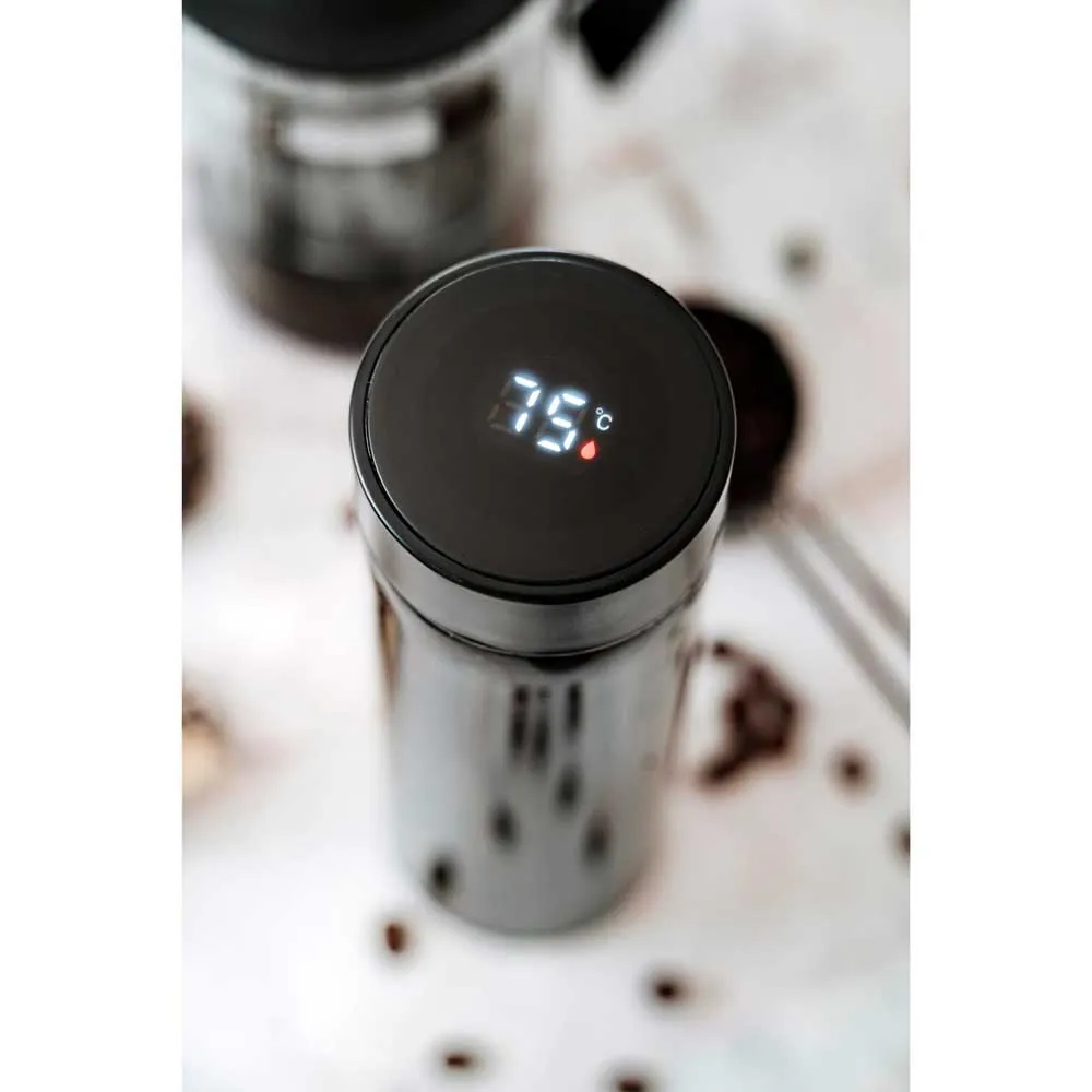 Termos AD 4506 z dotykowym wyświetlaczem LED, wskazującym aktualną temperaturę napoju, to doskonałe rozwiązanie dla miłośników gorących napojów. Dzięki niemu z łatwością można kontrolować temperaturę ulubionego napoju w czasie rzeczywistym. Wyświetlacz LED pozwala na precyzyjne odczytanie temperatury, unikając poparzeń lub picia zbyt zimnych napojów. Dodatkowo, dotykowy wyświetlacz sprawia, że obsługa termosu jest łatwa i intuicyjna. Urządzenie posiada precyzyjny czujnik termiczny odczytujący temperaturę po odwróceniu go do góry dnem na 3 sekundy. Izolacja próżniowa i podwójne ścianki utrzymują temperaturę gorących napojów do 8 godzin lub zimnych napojów do 12 godzin. W zestawie znajduje się sitko oddzielające fusy. Wbudowany akumulator wyświetlacza LED charakteryzuje się bardzo długą żywotnością do 30 000 dotknięć. Pojemność termosu wynosi 473 ml. Ten nowoczesny termos to nie tylko praktyczne urządzenie, ale również stylowy dodatek dla osób ceniących komfort i nowoczesne rozwiązania.