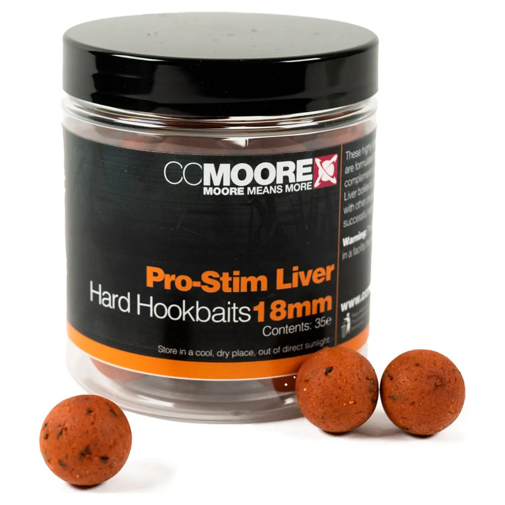 CC Moore Pro-Stim Liver Hard Hookbaits 12mm12 70 PROSTIM. Estas são iscas de anzol afundantes extra duras e duráveis, feitas com a Base Mix Pro-Stim Liver e endurecedores adicionados para combinar perfeitamente com os nossos boilies Pro-Stim Liver e outros produtos da nossa aclamada gama Pro-Stim Liver.