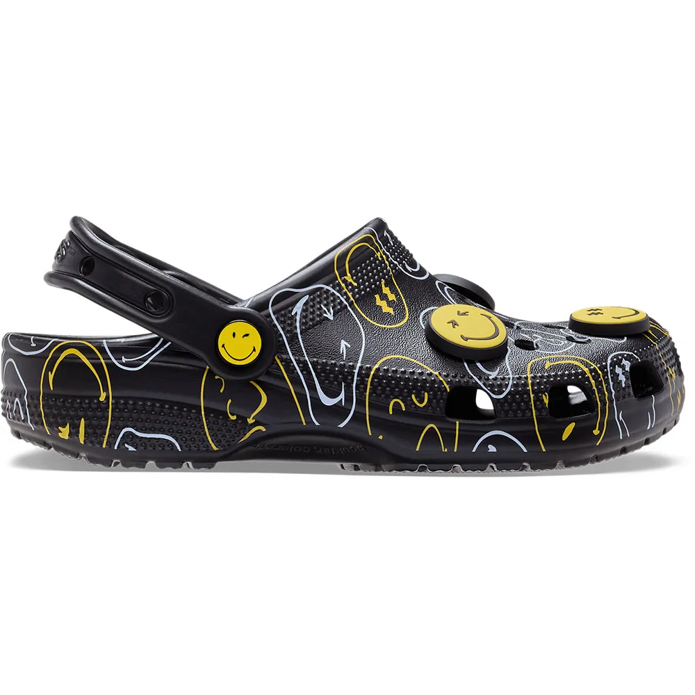 Uma sola Croslite™ confortável suporta um cabedal que apresenta uma estampa gráfica SmileyWorld por toda parte e vem pré-carregado com uma divertida coleção de enfeites Jibbitz™.