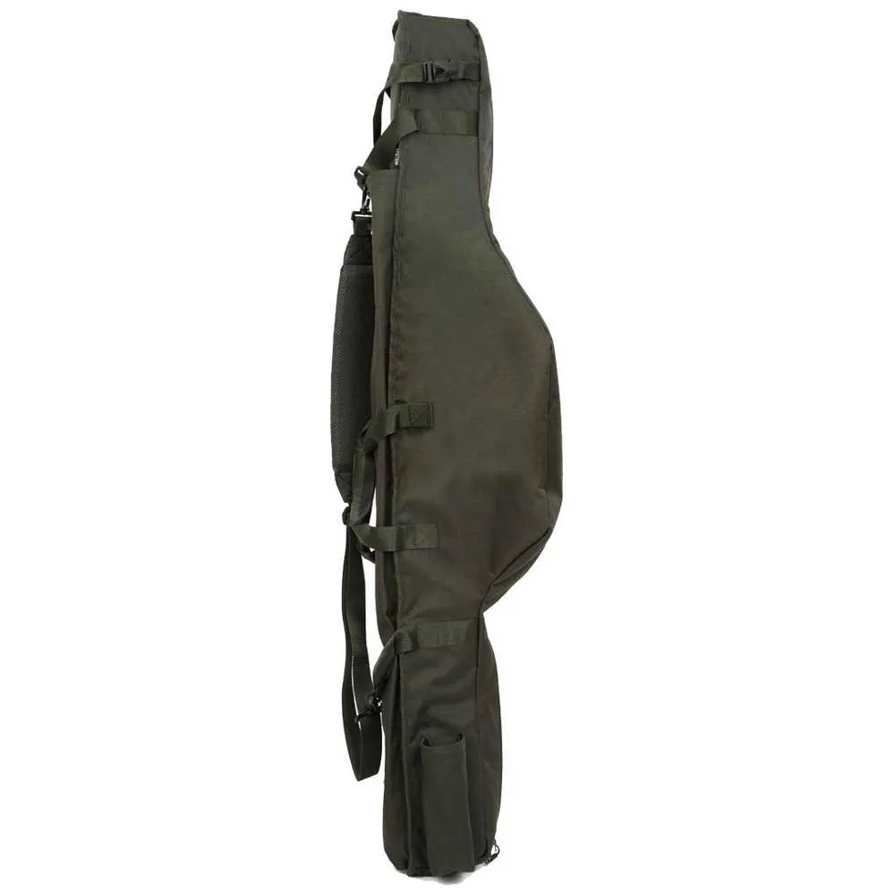 Cada bolsa tem dois bolsos com bases abertas e alças de suporte na parte superior para permitir que você carregue duas seções adicionais de haste. Também inclui um bolso traseiro para multas, rede e alça. A bolsa é feita de poliéster 600D.