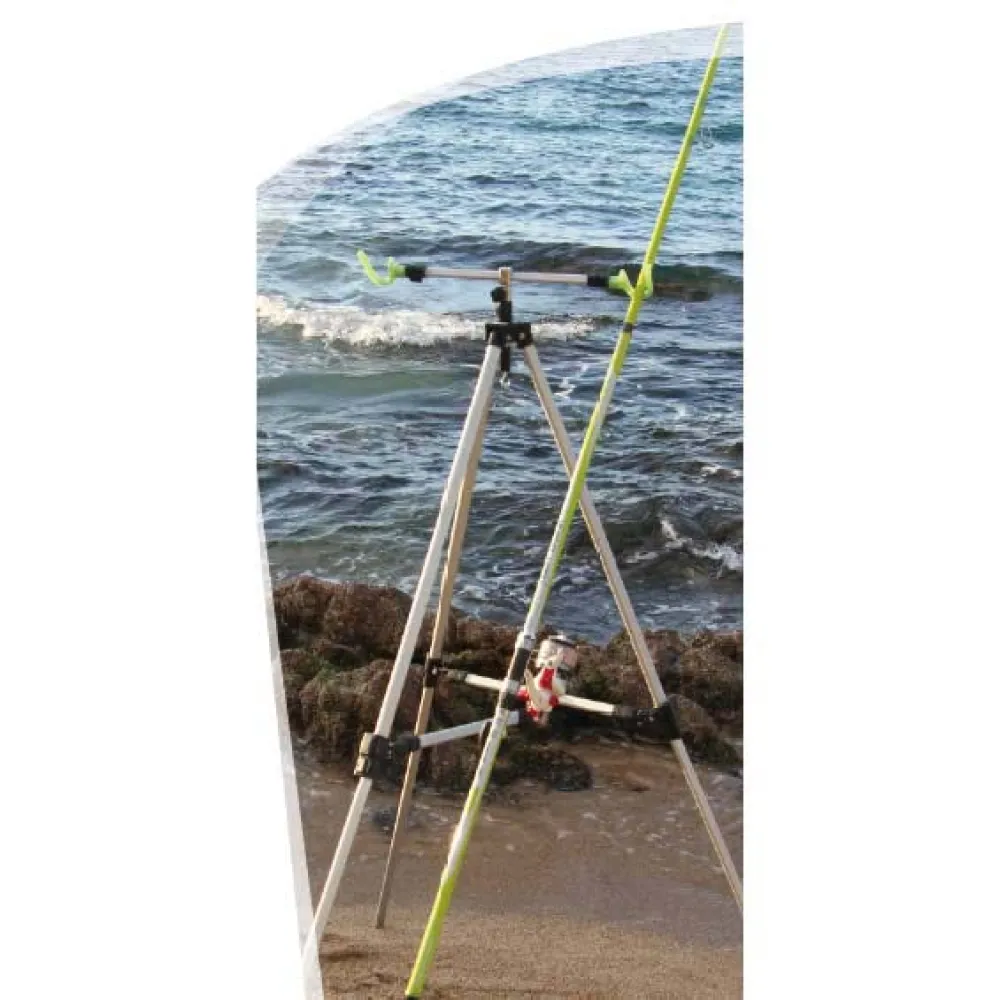 tripé Surfcasting especial. Ele permite colocar duas hastes quando a pesca. Ajustável em diferentes alturas e ângulos. Feito de alumínio e de plástico duro. Três pernas ajustáveis ​​e barra central para ajustar a abertura das pernas, da altura e variar o ângulo de colocação do tripé, em qualquer local. gancho Central onde você pode pendurar um acessórios da caçamba ou qualquer peso para melhorar a estabilidade geral. haste luminosa suporta. Fácil de montar e de dobragem. saco de transporte incluído.