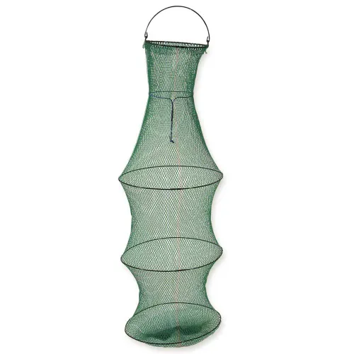 Este cesto de recolha apresenta uma construção de estrutura robusta que oferece excelente estabilidade e evita o colapso, mesmo quando totalmente carregado. Os anéis reforçados mantêm a forma circular do cesto de recolha, maximizando o espaço interno e evitando que os peixes fiquem presos nos cantos. O anel superior é equipado com um ponto de fixação forte para ancoragem segura ao seu suporte de vara ou plataforma, garantindo que sua captura permaneça seguramente contida.