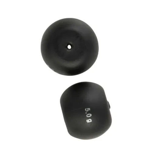 Subflutuadores em forma de bola com extremidades levemente achatadas e flutuabilidade de 5 gramas.