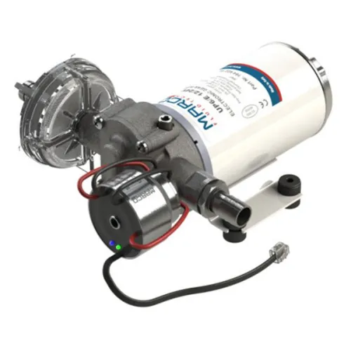 Bomba elétrica automática autoescorvante com engrenagens helicoidais em PEEK, válvula de retenção integrada e controle eletrônico. Corpo em latão niquelado e eixo em aço inoxidável. Principais aplicações: sistemas de pressão de água doce e kits de chuveiro em barcos, botes de borracha, veleiros e campistas. Disponível também com painel de controle.