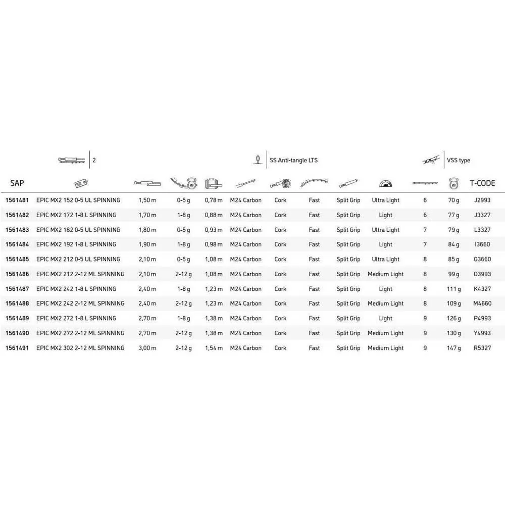 A série Epic Mx2 de varas de fiar são projetadas para pesca leve com isca. Os Blanks têm uma ação rápida e sensível, tornando-os perfeitos para lançar pequenas iscas em rios e córregos. Estas varas também podem ser perfeitamente bem usadas para pesca de poleiro em muitas circunstâncias diferentes. As hastes são finalizadas com componentes de qualidade, como um design de assento de carretel de toque em branco e guias anti-emaranhado.
