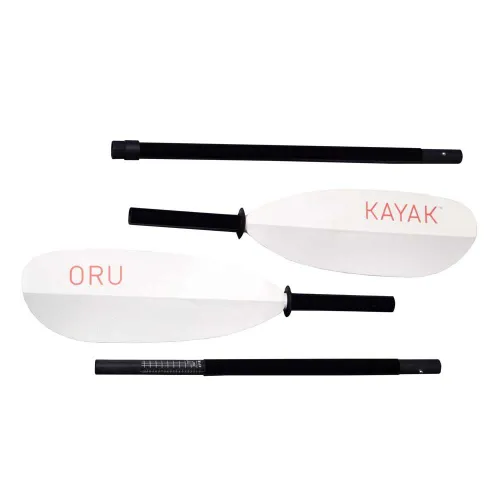 O que é um caiaque sem uma pá? A pá Oru - em branco brilhante para combinar com o caiaque - é dividida em quatro peças, para que possa ser facilmente guardada dentro do caiaque Oru em forma de caixa. Possui um eixo de fibra de vidro leve e lâminas de plástico ABS super-resistentes. A pá é realmente personalizável: um conector de grampo rápido permite ajustar o comprimento (220-230 cm) da pá e os ângulos das lâminas.
