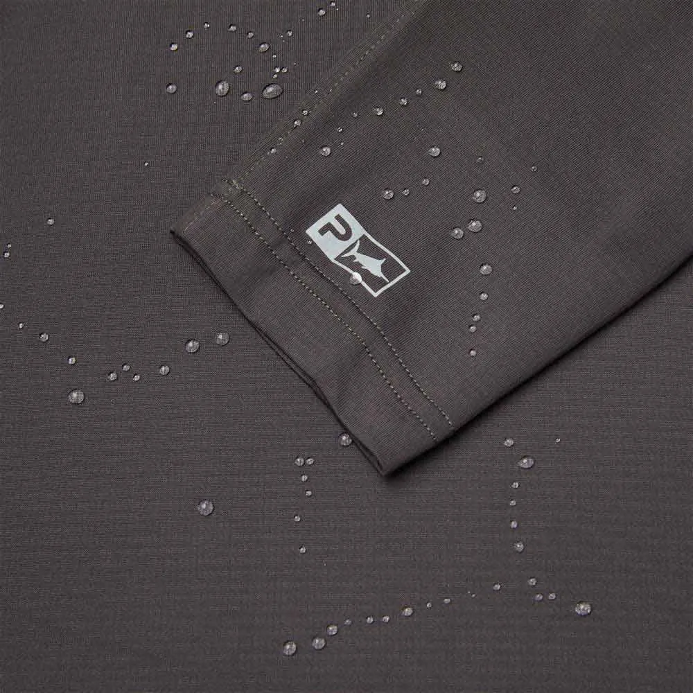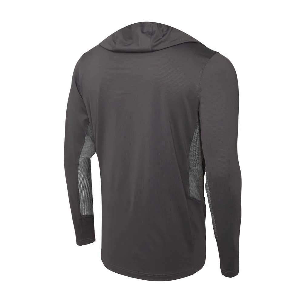O Exo-Tech oferece proteção de 360° para longos dias ao sol. Apresenta proteção UV 50+, tecido reciclado elástico em 4 direções com repelência à água e manchas livre de PFAS, máscara facial integrada, bolsos com zíper e ventilação estratégica para fluxo de ar.