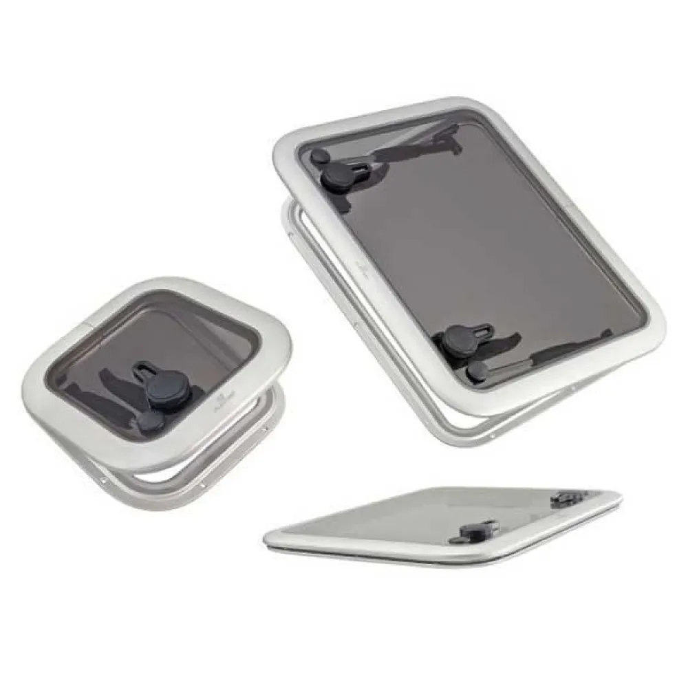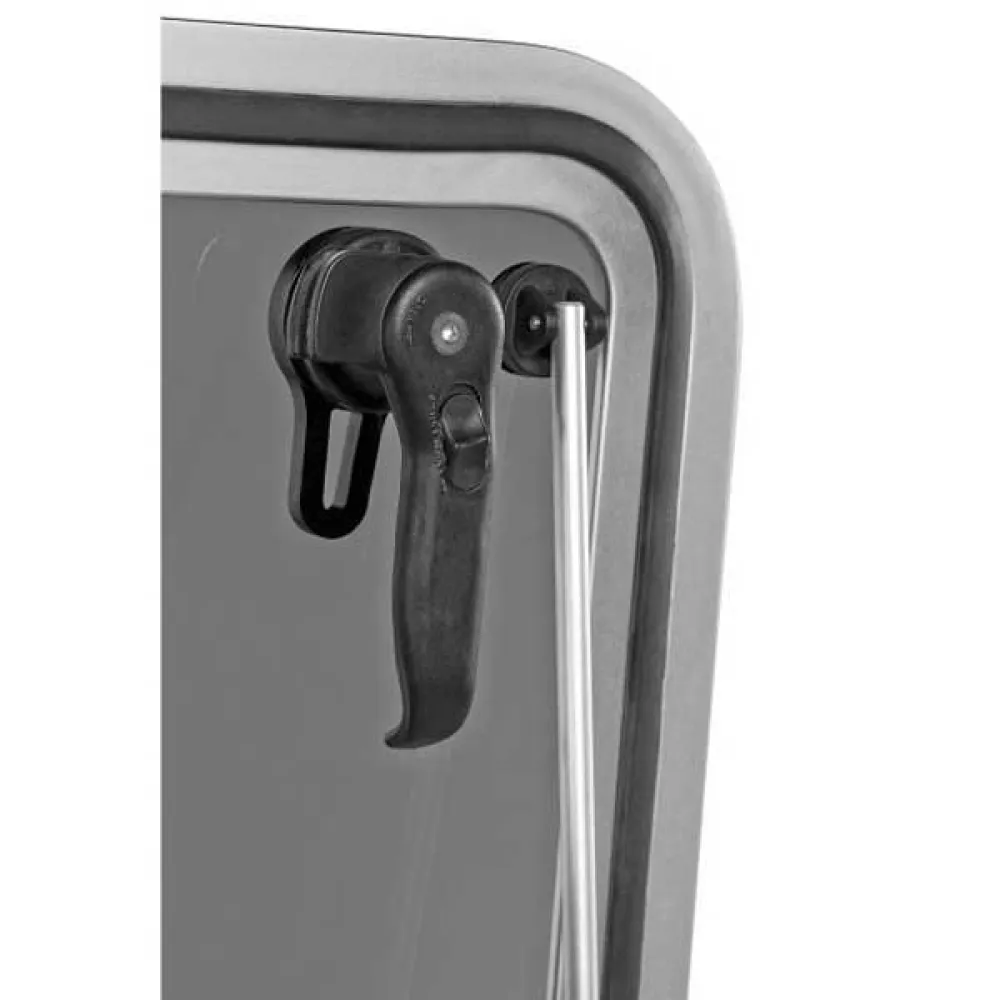 A gama de escotilhas de convés Plastimo combina uma estanqueidade à água ideal, uma instalação fácil e um design elegante. Dispositivo de abertura A forma ergonómica das pegas permite um espaço confortável para uma excelente aderência. Possuem um fecho de bloqueio que impede a entrada de fora. Não é necessário instalar outro sistema de bloqueio do lado de fora. Todos os modelos estão equipados com estai ajustável. A abertura ajustável é tão simples quanto soltar o estai para obter a posição certa. Dobradiças em alumínio. Navegação: Cruzeiro costeiro ou de águas azuis.