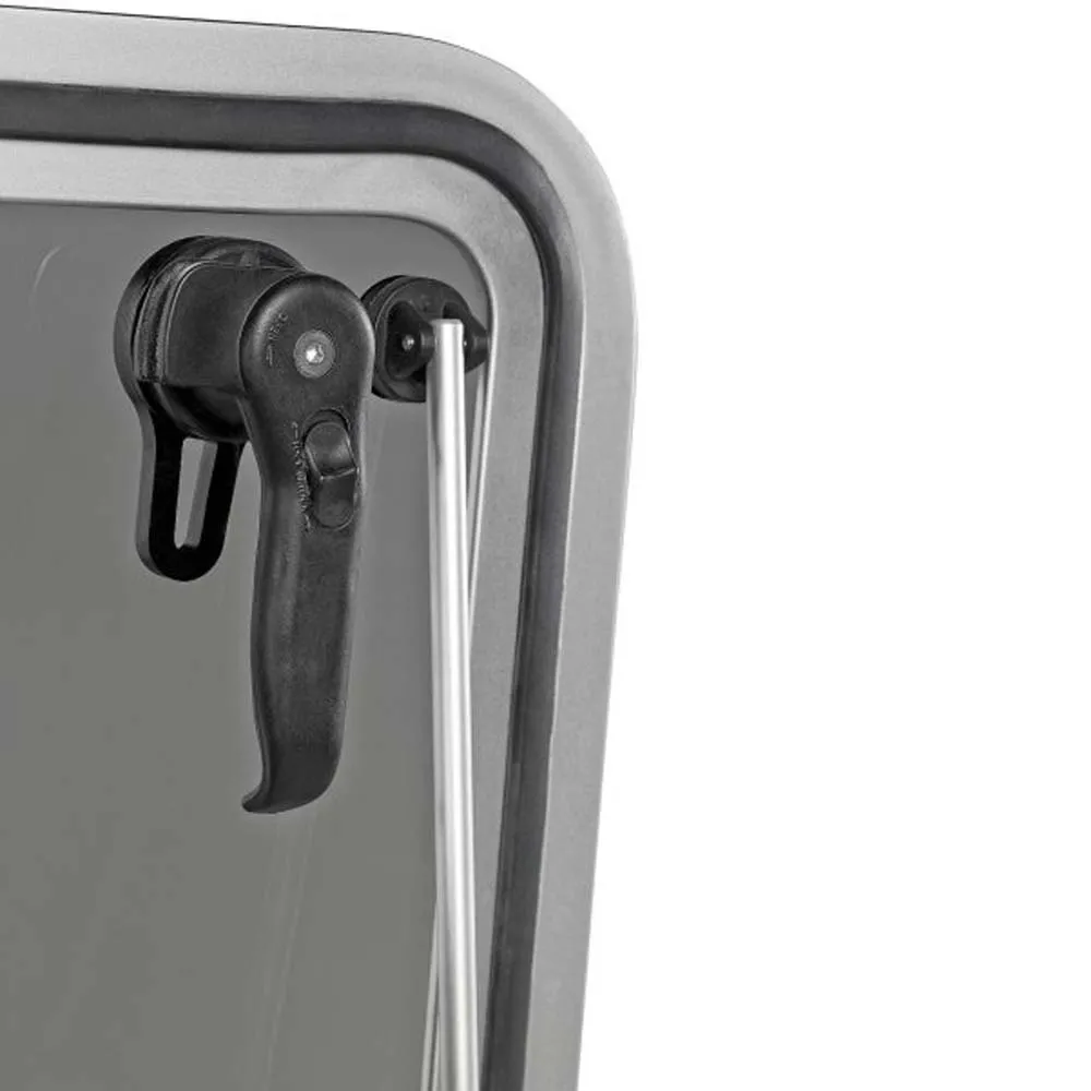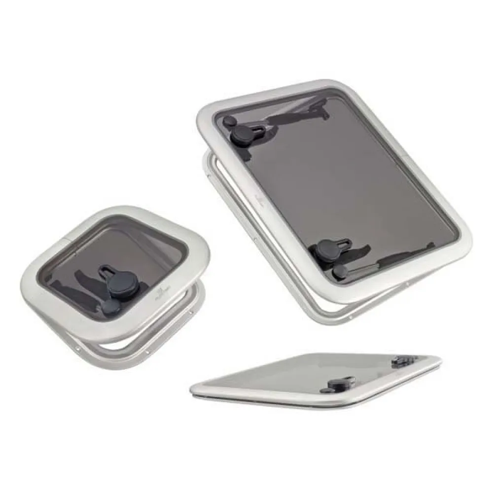A gama de escotilhas de convés Plastimo combina uma estanqueidade à água ideal, uma instalação fácil e um design elegante. Dispositivo de abertura A forma ergonómica das pegas permite um espaço confortável para uma excelente preensão. Possuem um fecho que impede a entrada de pessoas de fora. Não é necessário instalar outro sistema de fecho do lado de fora. Todos os modelos estão equipados com um estai ajustável. A abertura ajustável é tão simples como soltar o estai para obter a posição certa. Dobradiças de alumínio. Navegação: Cruzeiro costeiro ou em águas azuis