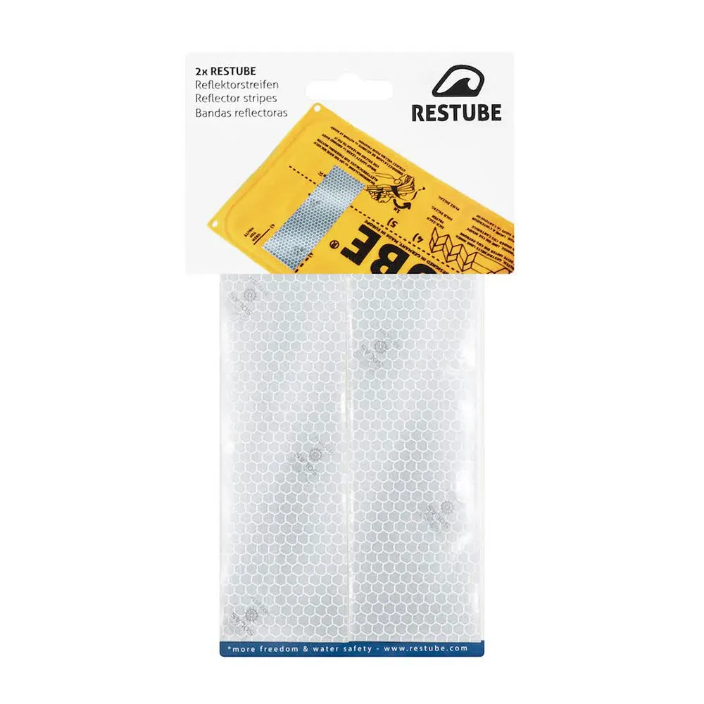 Com as tiras refletoras Restube, você aumenta significativamente a visibilidade do seu Restube, especialmente ao entardecer e em condições de pouca luz. Se um feixe de luz, como uma lanterna, atingir a faixa, ela será refletida de forma extremamente forte. Você pode simplesmente colar a tira na ponta da bóia. Para garantir a força adesiva ideal, siga as instruções.
