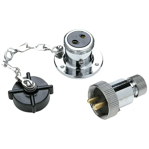 Contatos duplos de latão fornecidos completos com corrente e tampa serrilhada com rosca de plástico preto.