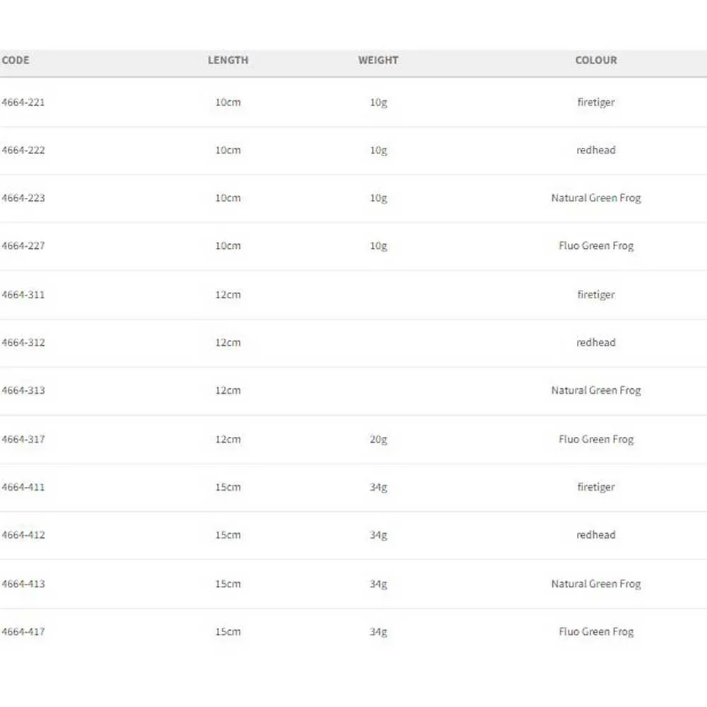 Uma imitação realista de um sapo real, feito de um material macio. O Sapo IRIS tem uma ação muito sedutora. Em uma recuperação muito lenta, as pernas do sapo já começarão a se mover. Os indicadores de tamanho de gancho na parte traseira facilitam muito a montagem. Por exemplo, em combinação com nossos cabeçotes SPRO (# 6/0 ou # 8/0). Além disso, esta imitação de sapo é perfeita para pescar com Gamakatsu Offset ou Wormhooks maiores.