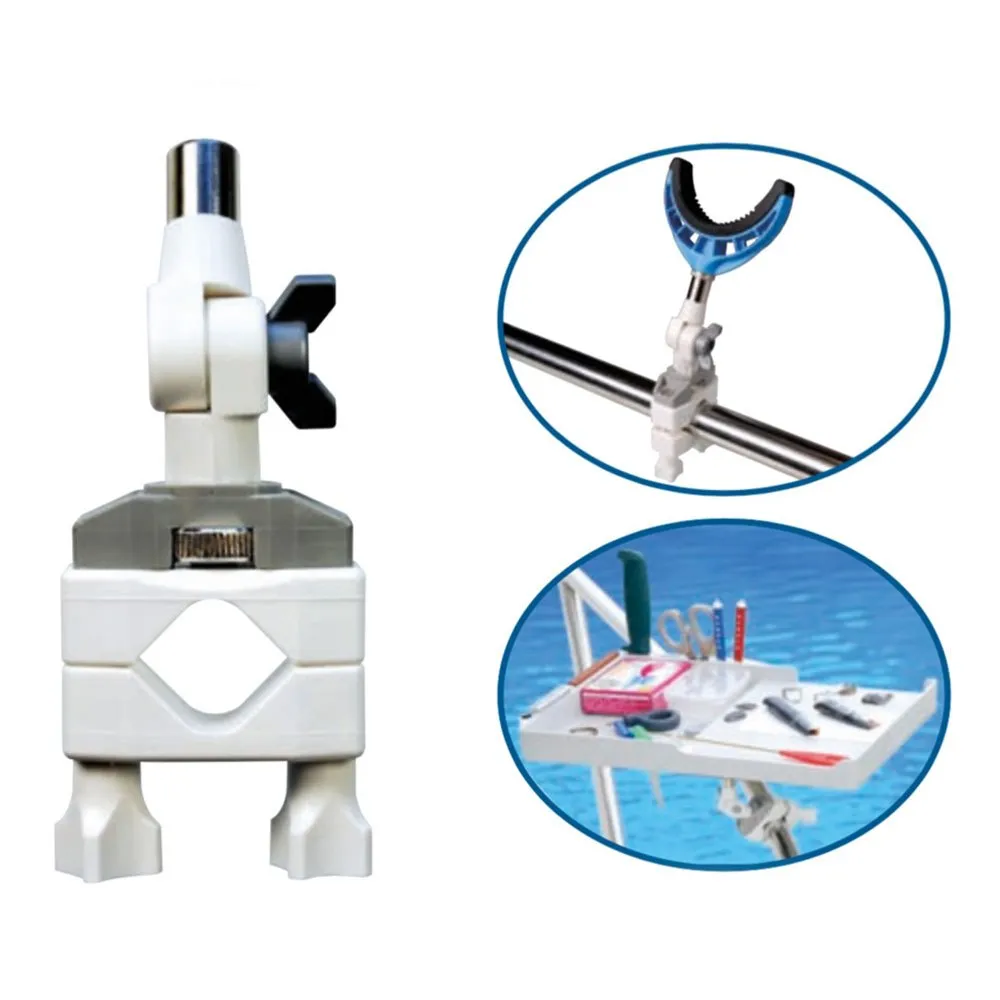 Permite fixar apoios de cana, tabuleiros de isco e outros acessórios em barras de secção circular ou quadrada.