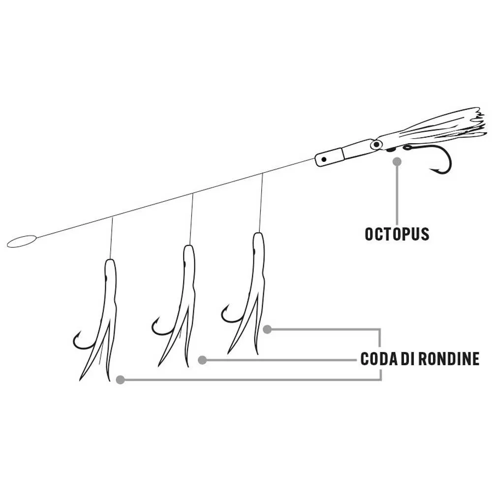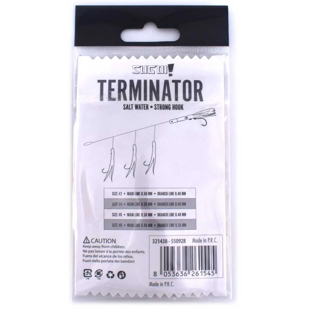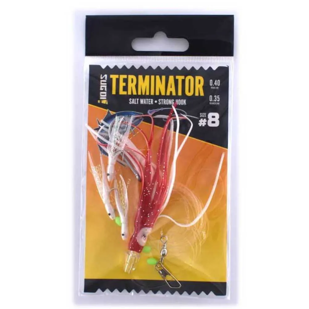 O Sugoi Terminator é um conjunto de pesca de corrico artesanal com um polvo de silicone macio de 10 cm, cauda de andorinha de 4.5 cm com filamentos brilhantes, contas fluorescentes e um anzol forte de aço inoxidável.