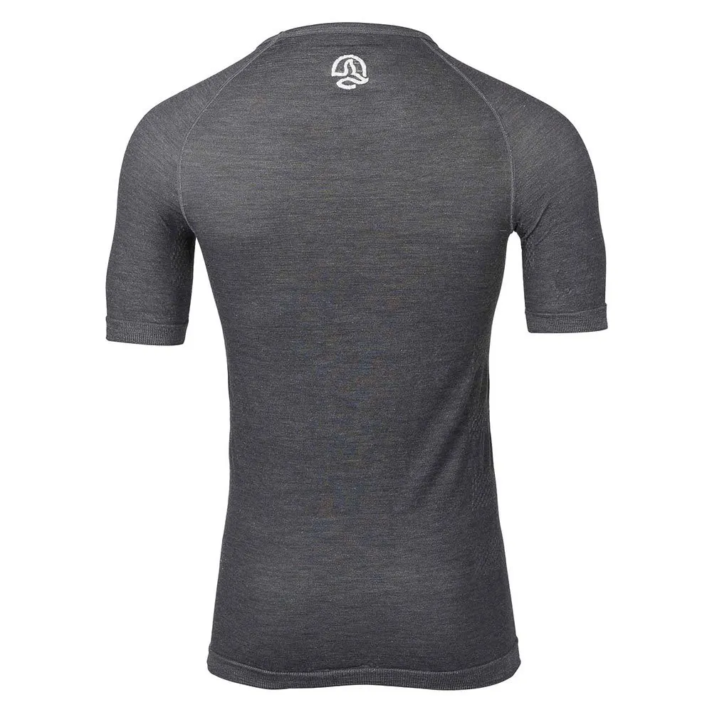 T-shirt de manga curta, primeira camada, quente, respirável e sem costuras, feita de uma mistura de Tencel e lã em contato com a pele e elastano coberto com poliamida reciclada Seacycle na parte externa.
