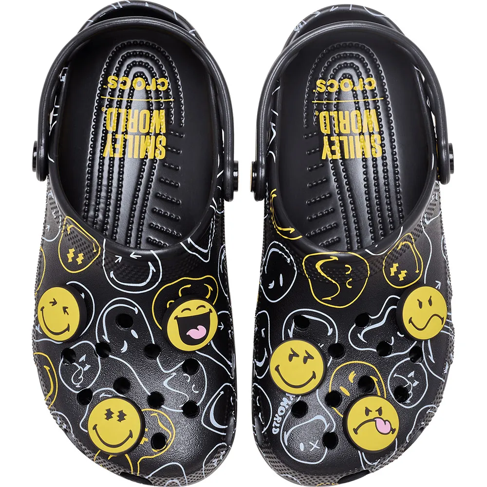 En bekväm Croslite™-sula stödjer en ovandel som har ett heltäckande SmileyWorld-grafiskt tryck och levereras förladdad med en rolig samling Jibbitz™-märken.