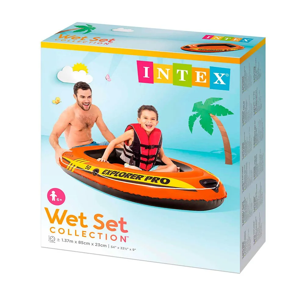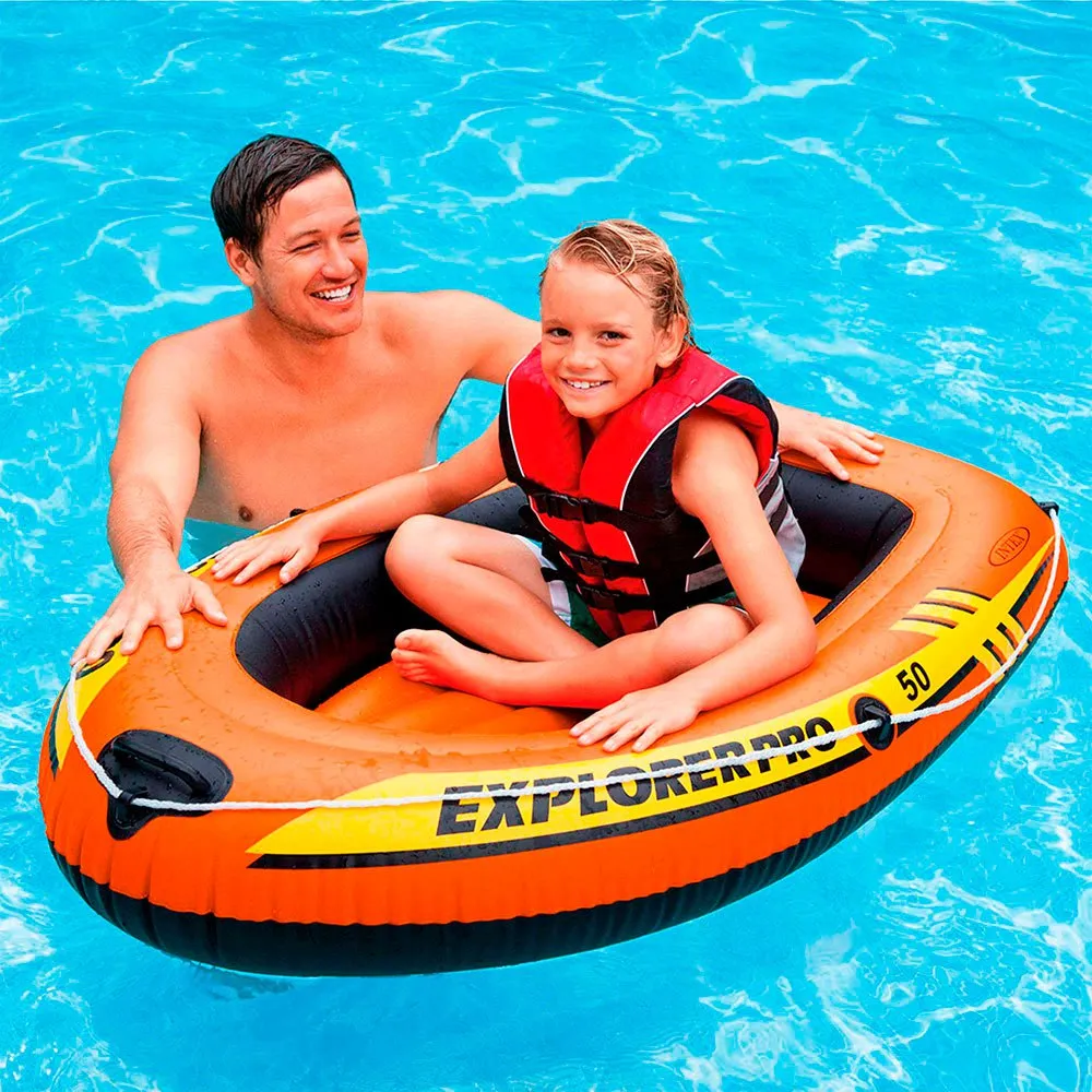 Intex uppblåsbara barn Explorer Pro båt, konstruerad för ett barn Mått: 137x85x23 cm och stöder en maximal vikt på 40 kg. Explorer Pro 50 bräda har 2 luftkammare plus en extra för att hålla båten flytande vid incidenter. Kommer med: rep för att hålla på, hantera i bågen för att hjälpa till att röra sig genom vatten jag strålar teknik uppblåsande golv som ger bättre stabilitet och komfort.