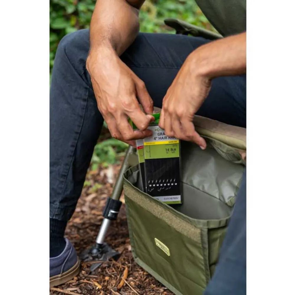 Ett utmärkt sätt att hålla dina värdesaker säkra när du fiskar från en stol. Den perfekta platsen att snabbt lägga din telefon, nycklar, plånbok och mottagare. Tillverkad av 150D PU Flex-tyg med 5 000 mm vattentätt betyg. Förstärkt med PE-skiva för styrka. Enkel kardborreknäppning.