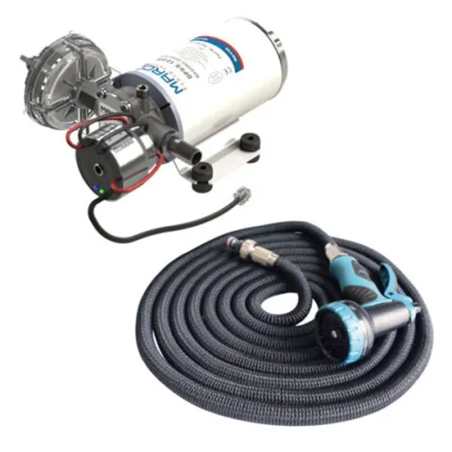 Kompletta kit inklusive en elektronisk självsugande elektrisk pump med elektronisk styrning. Utrustad med spiralformade Peek-växlar, in-line filter, förnicklad mässingskropp och backventil. Med 15 m töjbar slang och jetpistol, utrustad med snabbklicksanslutning, stoppstråle, backventil och avtryckare med jetreglering. Satsen är särskilt lämplig för tvättning antingen med salt eller färskvatten.