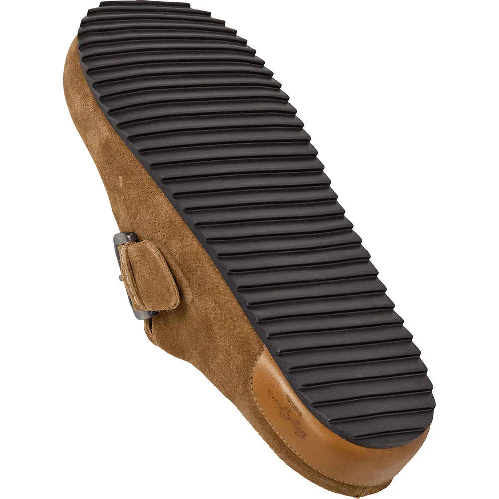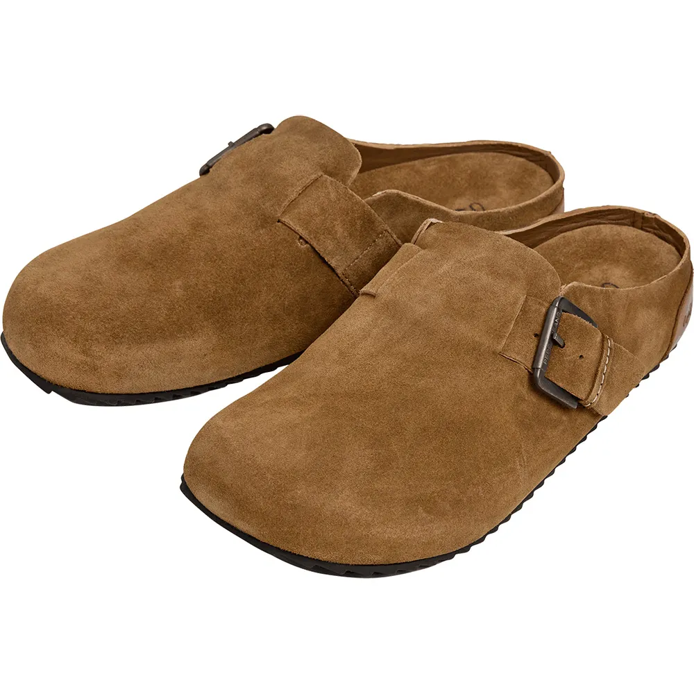 Corby Clog C sandal tillverkad i mockaläder från ko med rem och metallspänne, anatomisk fotbädd, klassisk logotyp på innersulan och tandad TR-yttersula.