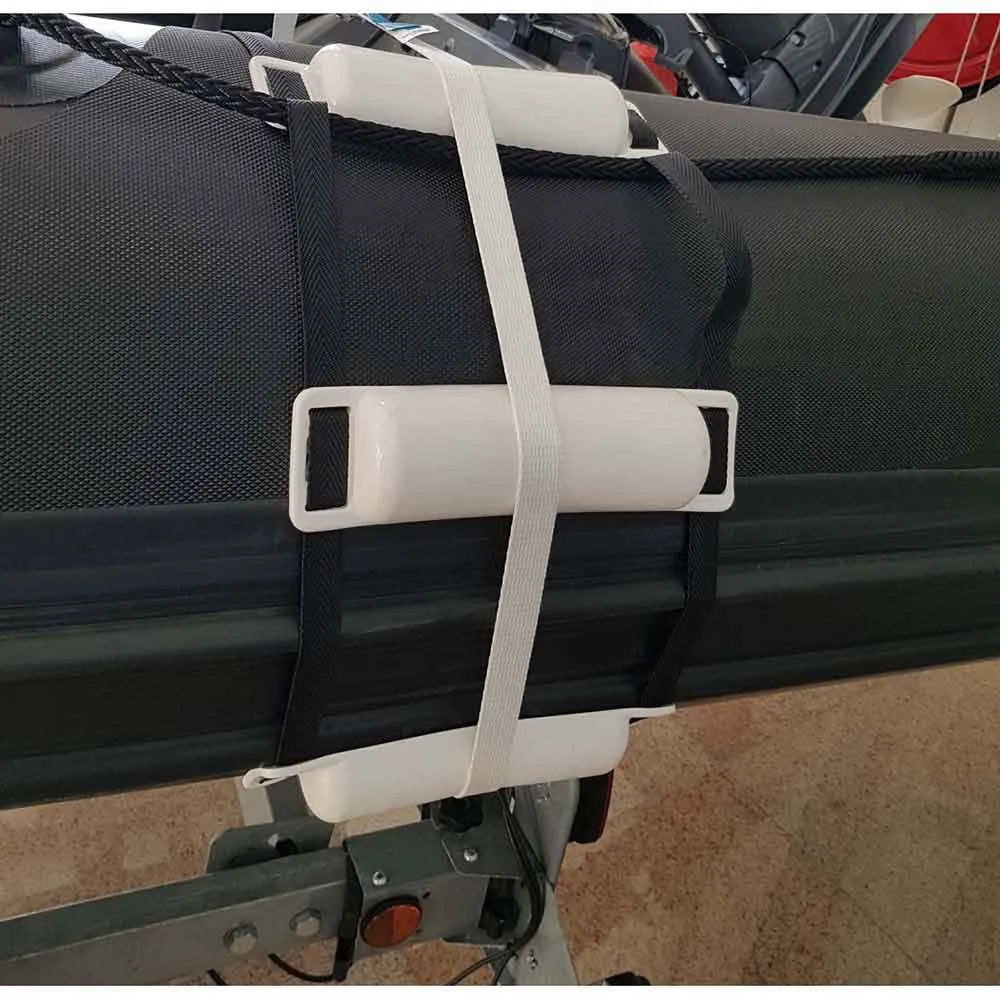 - Ger effektivt skydd mot gnidning och skavning: Anpassar sig till alla skrovformer, och mer speciellt till ribbformade rör. Också idealiskt för att skydda skrovet eller rören på ett revben när det är släp: Sätt bara in Halfmoon fendrar mellan båtskrovet och bälten som säkrar båten på trailern.
