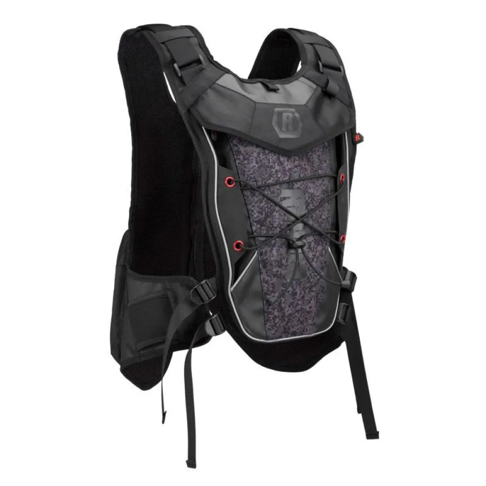 Fullfjädrad fiskeväst med integrerad ryggsäck.
