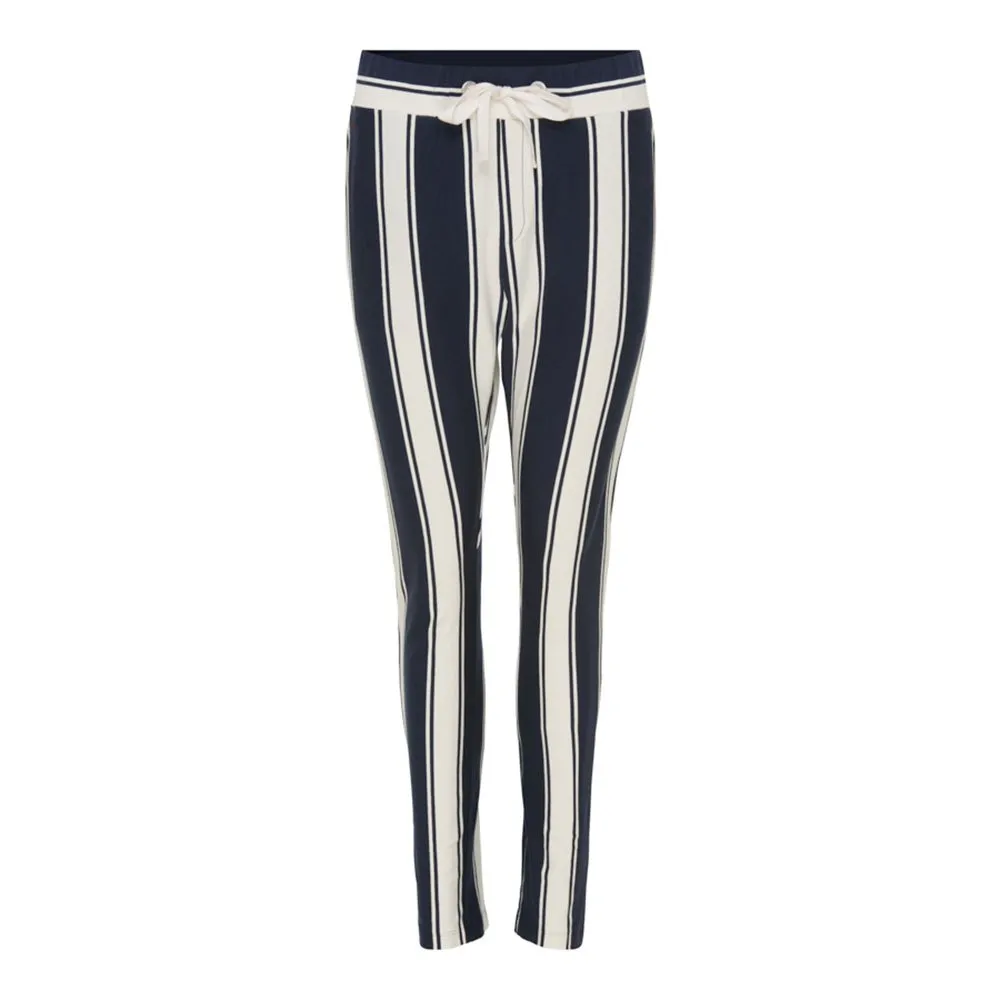 Det marinblå randmönstret ger en touch av sofistikering till den övergripande looken, vilket gör dessa byxor lämpliga för både vardagliga och halvformella tillfällen. Det högkvalitativa tyget garanterar komfort och hållbarhet, vilket gör att de kan användas under lång tid.