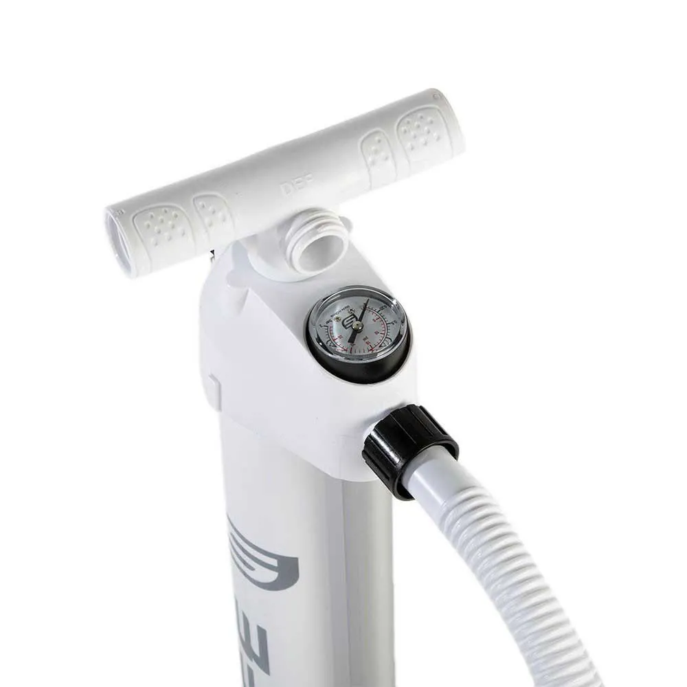 En patenterad SAFE-pump med dubbla flöden med luftmätare för uppblåsning av uppblåsbara supbrädor, med möjlighet att blåsa upp till tryck 26psi. Pumpen har en något långsträckt form, är mycket robust och har aluminiumaxeln; dessa egenskaper gör det lämpligt att blåsa upp ett bord på 4/5 minuter, vilket ger ett minimum av ansträngning. KAPACITET_ 1,8 + 1,8 liter, max. tryck 26psi enligt DIN EN 16051 EGENSKAPER_ tätningar och anti-sandfilter för lång livslängd för pump och supbräda, hög luftflödeskolv för lättare uppblåsning, omkopplare för dubbel / enkelverkan.
