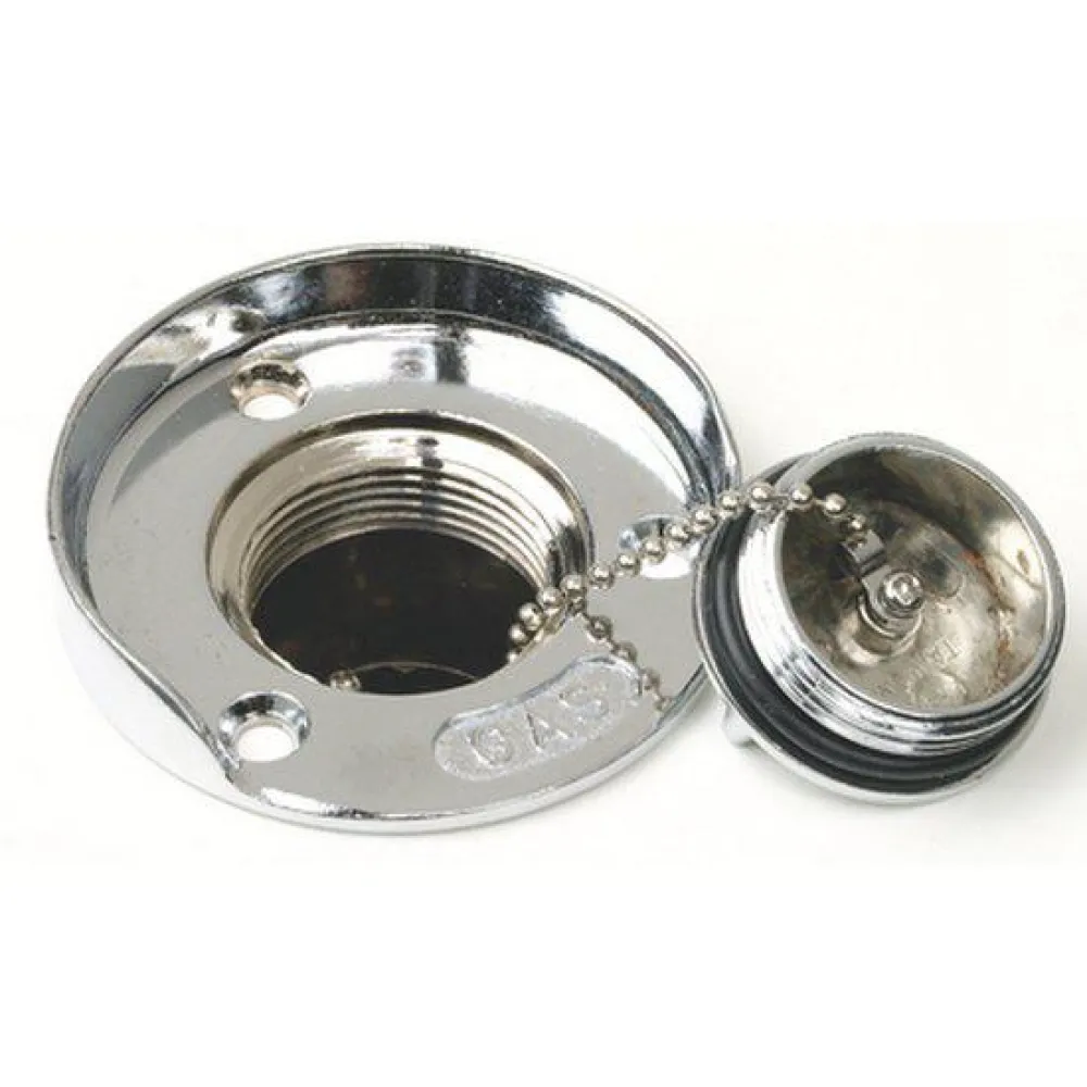 Säkert fastsatt lock: Locket är säkert fäst vid fyllningshalsen med en hållbar kedja eller lina, vilket förhindrar oavsiktlig förlust under tankning och säkerställer att det alltid är precis där du behöver det. Bred 3-tumsfläns: Har en betydande 3-tumsflänsbredd som ger en bred, stabil monteringsyta för en säker installation och täcker elegant slangurtaget för en ren, professionell finish.