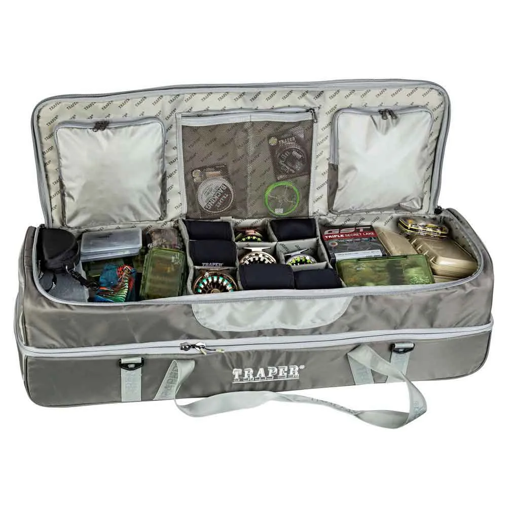 Denna professionella väska är avsedd för att bära den viktigaste utrustningen för flugfiskare. Perfekt att packa i bilen, otroligt stabil. När den tas ut har du enkel tillgång till alla föremål. Nedre delen är uppdelad i fack där det finns plats för åtta tubfodral. Övre delen har tre avdelningar. I mitten kan du placera nio rullar och extraspolar. Två stora sidofack rymmer reservlinor, många flugaskar och annan utrustning. Det finns tre platta fickor under locket för nylonlina och mindre tillbehör.