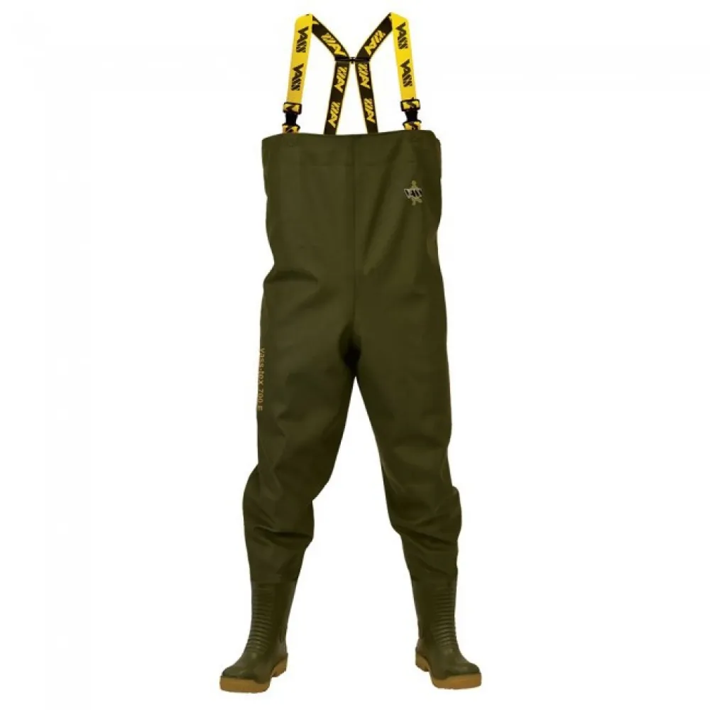 Den högsta kvaliteten på PVC-vadare som finns i sin kategori. Slitstarkt Vass-Tex 700-seriematerial med flexibla bi-stretch-egenskaper för komfort och tillförlitlighet. Denna Vass-vadarserie använder det högkvalitativa Vass-Tex 700 släta PVC-yttermaterialet med en mjuk polyesterbaksida (lätt stretch för komfort men fungerar också som en stötdämpare på sömmarna). Kroppen är sammansmält med vår nya "Vass Boot" Tough Chunky Yellow Soled-stövel som erbjuder komfort, tillförlitlighet och förstärkta slitstarka egenskaper. Vass-Tex 700E Nova drar nytta av Vass vanliga höga tillverknings- och materialstandard och inkluderar även funktioner som fyrdubbla svetsade sömmar, elastiska och boxsydda hängsleshällor, lätt reparationsmaterial (se vår reparationsguide) och invändig dragsko i bröstvadaren för säkerhet och komfort. Även om den inte är lika högspecad som Vass-Tex 740E SuperNova erbjuder denna serie oöverträffad kvalitet till ett utmärkt pris.