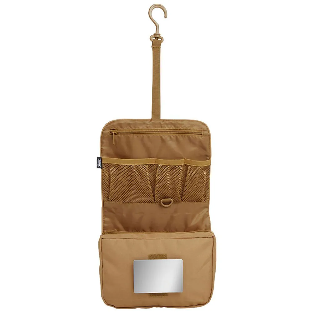 Robust 600DEN polyestermateriale, 1 rum med lynlås, 2 meshlommer med elastik, 1 stort udfoldeligt rum med lynlås (24 cm x 14 cm), aftageligt, splintret spejl, ekstra velcrooverflade til spejlet, roterende plastkrog til ophængning, spænde aflåselig, håndbærende løkke, D ring, højde 20 cm x bredde 24 cm x dybde 5 cm højde 40 cm x bredde 24 cm x dybde 3 cm (udfoldet).