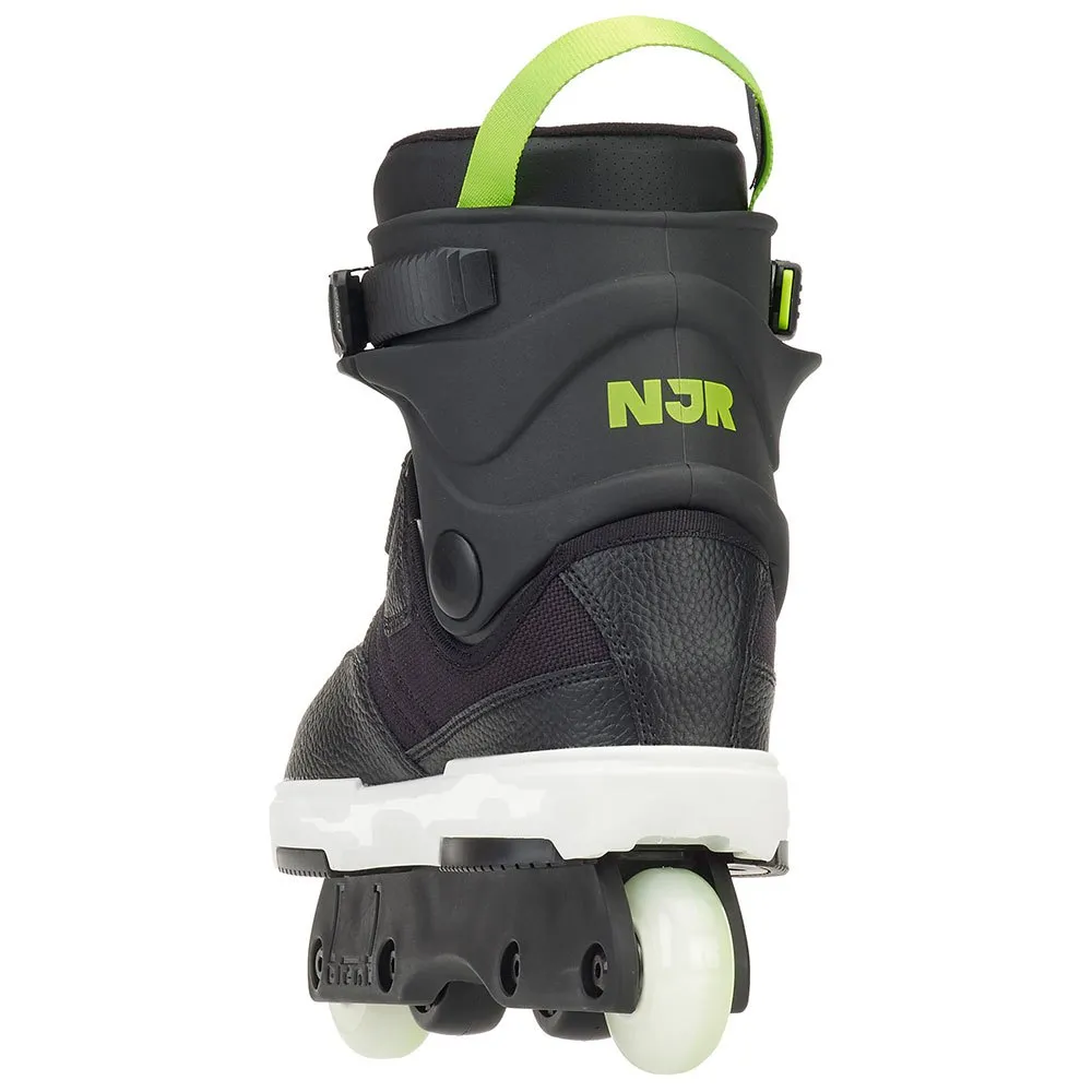 NJR er en to-størrelse gadeskøjte til børn, designet til park og bymæssig brug. Holdbar og behagelig, denne skøjte hjælper børn med at lære tricks bedre ved hjælp af strategisk rammedesign og slibearealer. Funktioner, der gør NJR til en ideel første aggressiv skøjte: Size Adjuster aftagelig pude inde i foringen, Rollerblade 58mm / 90a gadehjul, SG5-lejer og 42mm anti-rocker-hjul. Den tomme ramme er bygget med UFS (Universal Frame System) inklusive fire udskiftelige sjæle og negative indsatser, der stiger over sjælpladen for at reducere friktion ved slibning. En High Performance skumforing med dobbelt polstret tunge og støddæmpere afslutter pasformen med en 45 graders rem, manchetspænde og snørebånd. NJR er alt, hvad der kræves til en gateskat på indgangsniveau.