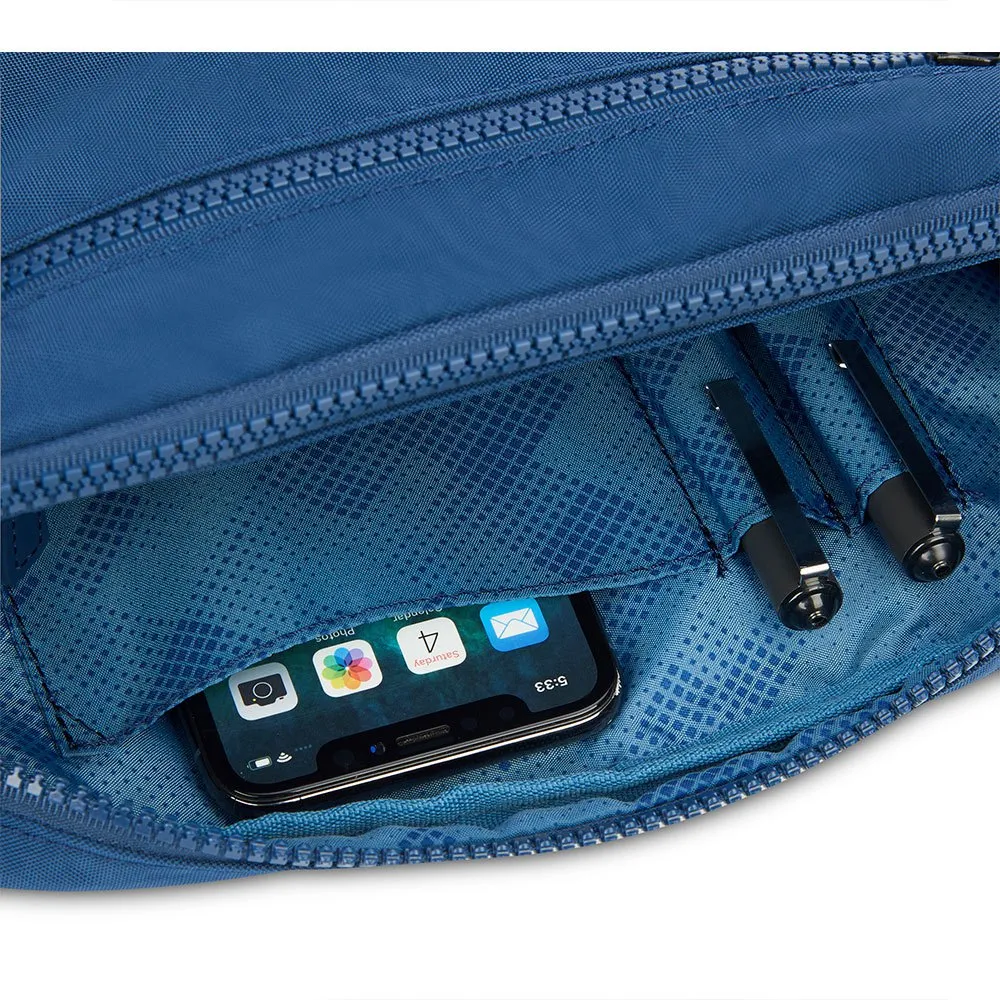 Fremstillet af Crinkle Nylon, et slidstærkt og vandtæt stof, har den to hovedlommer, en frontlomme med lynlås og en sikker baglomme.