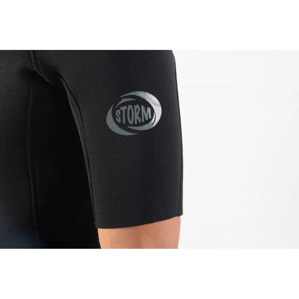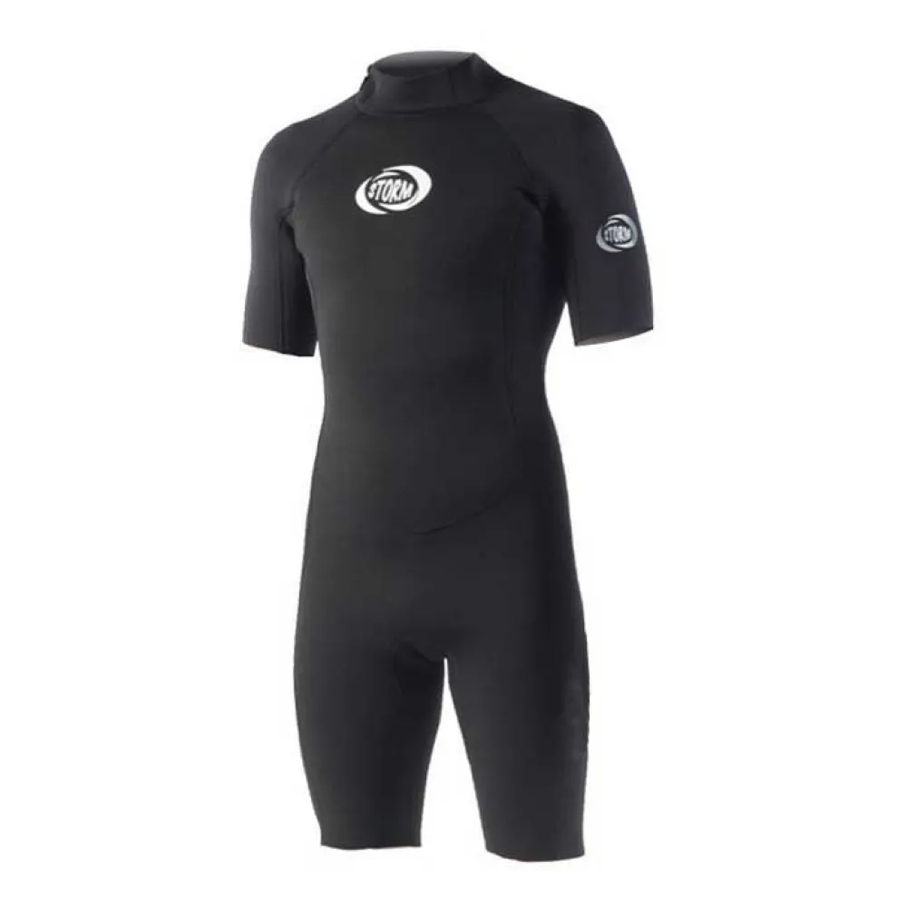 STORM BLADE Flatlock Spring Short Sleeve Back Zip Suit i sort er en højtydende våddragt designet specielt til surfing. Denne dragt kombinerer funktionalitet og stil for at give en behagelig og strømlinet oplevelse i vandet.