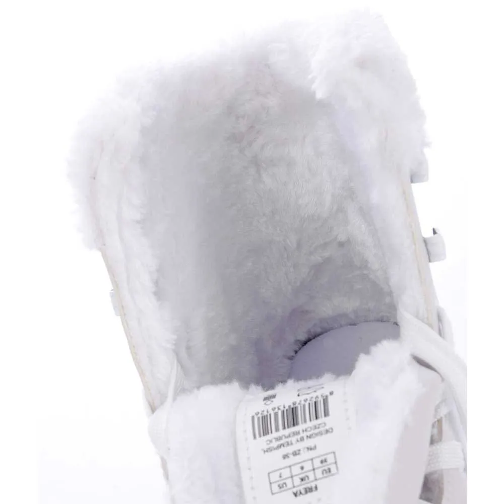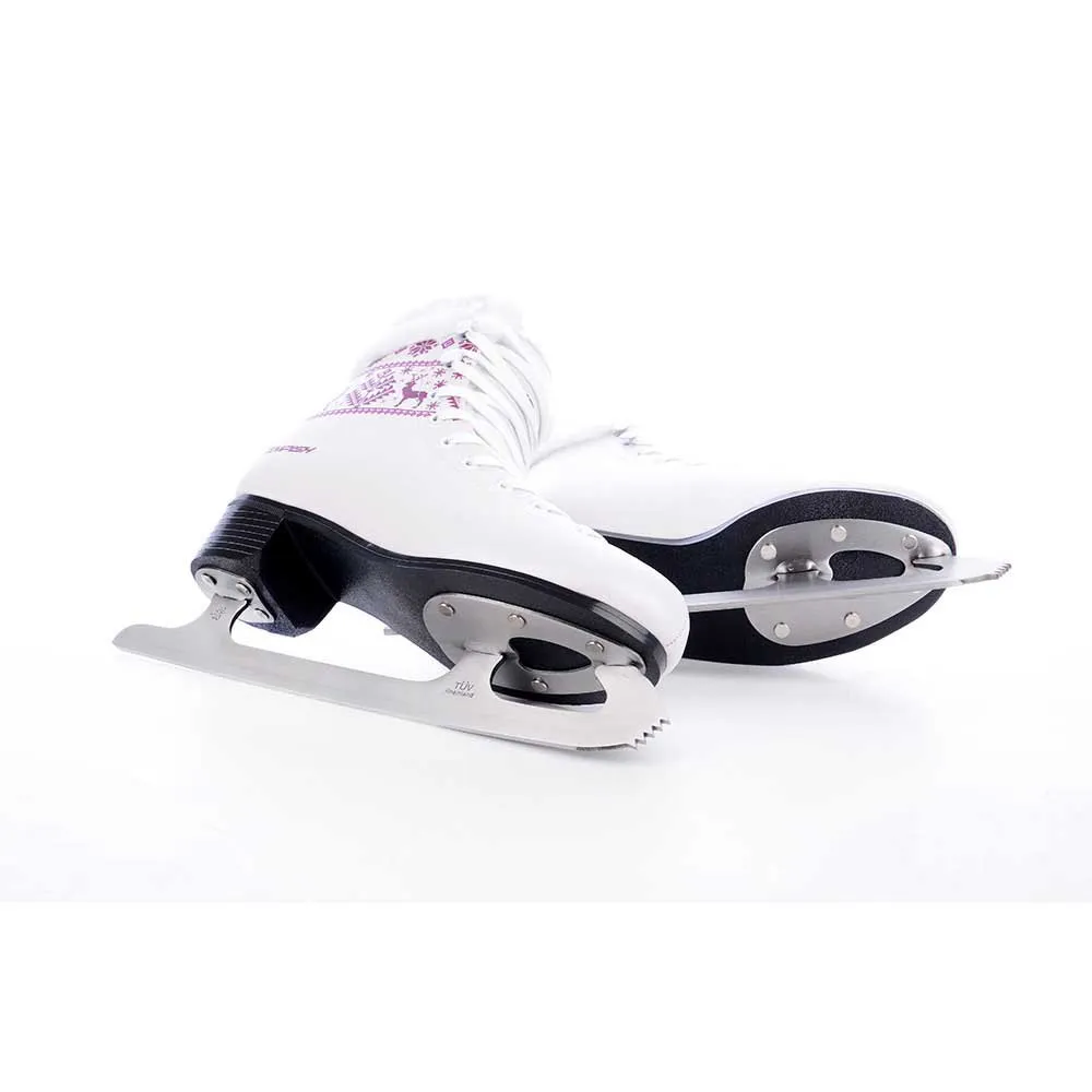 Klassisk dameskøjte FREYA er beregnet til fritids- og modeskøjteløb. Skate er lavet af PVC cool resist materiale med PEARL EFFECT overflademodifikation af funklende udseende kombineret med traditionelt nordligt vinterprint. Skøjten har en anatomisk-baseret skumbandage i tungeområdet. Den behagelige følelse af komfort og varme er leveret af pelsimiteret foring. Den er behagelig at røre ved og har en god isolerende funktion. Klingen er lavet af rustfrit stål og poleret.