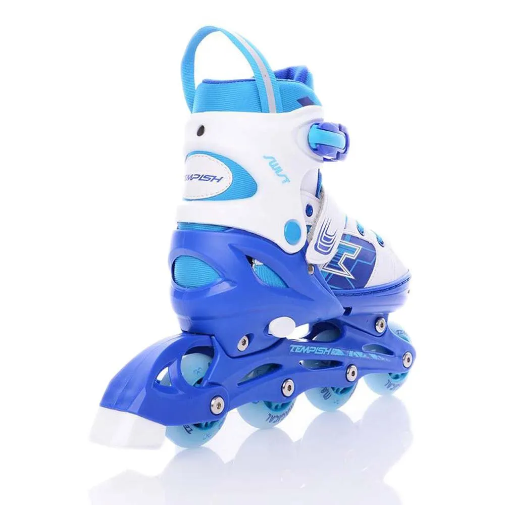 De mindste rulleskøjter i TEMPISH kollektionen. SWIST FLASH skøjter starter på pladsen 26!!! Den justerbare skeletstørrelse gør, at skoen kan ''vokse'' efterhånden som foden og brugeren vokser! Justering af størrelsen er meget let og praktisk takket være EASY PUSH-systemet - ved at trykke på sikkerhedslåsen og blot justere skostørrelsen. Skøjterne kan indstilles til 4 størrelser. Manchetten holder barnets fod fast over anklen. Stramningen kan styres ved hjælp af et spænde med et AUTOLOCK-system og en tandrem. Hjulene er fra CATCH serien 64x24 mm, 82A. De 2 hjul på hver skøjte er forsynet med LED'er. Velegnet til både begyndere og øvede skatere.