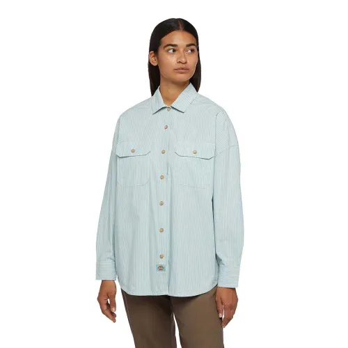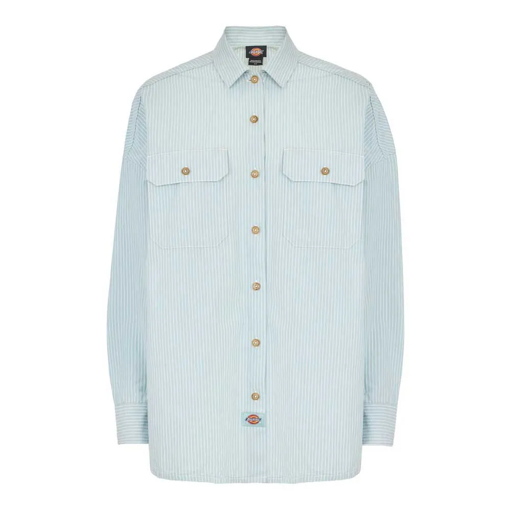 Hergestellt aus 100% Baumwolle mit gestreifter Popeline-Ware, mit zwei Front-Brusttaschen und dem ikonischen gewebten Dickies-Label über dem Saum.