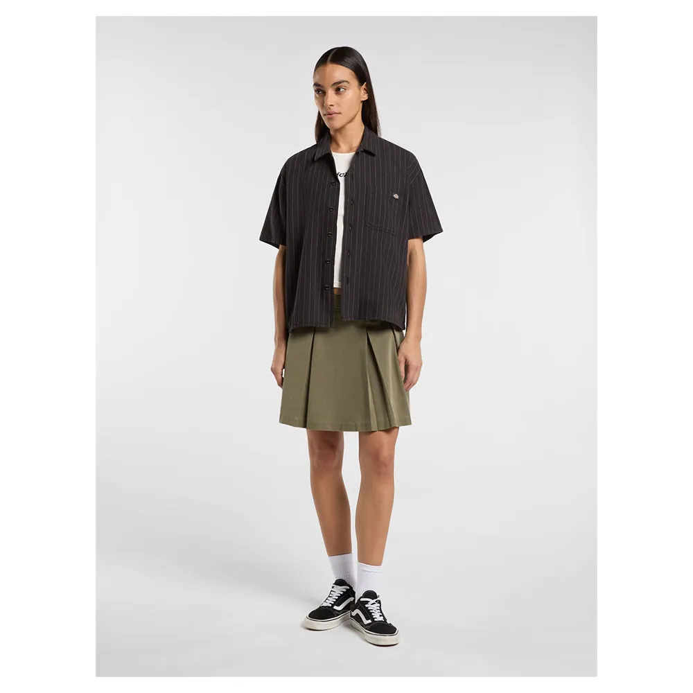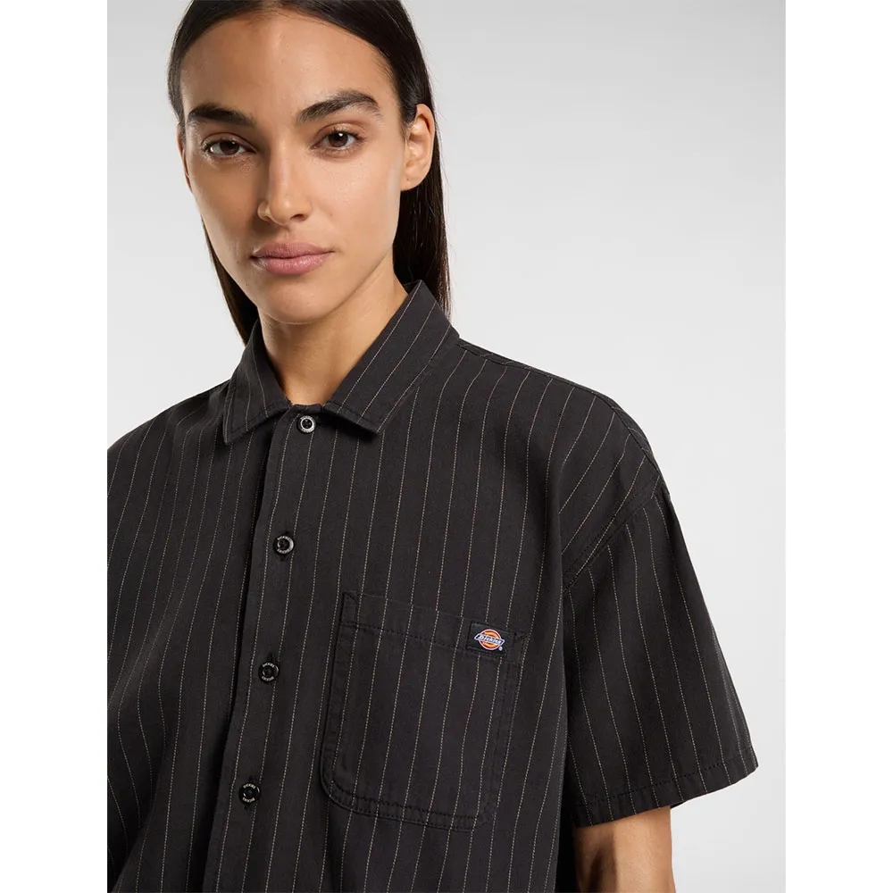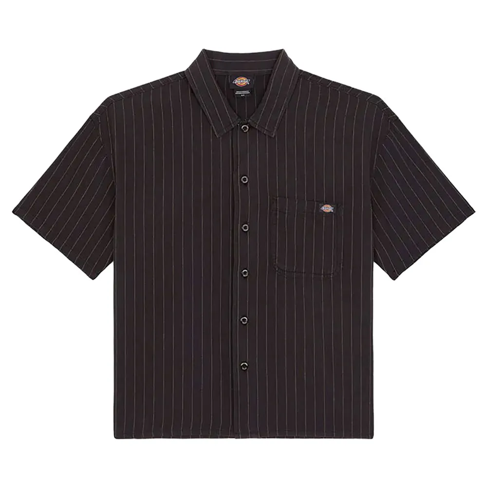 Es besteht aus 100 % stückgefärbter Baumwolle mit Nadelstreifenmuster und hat eine Brusttasche links mit gewebtem Dickies-Etikett.