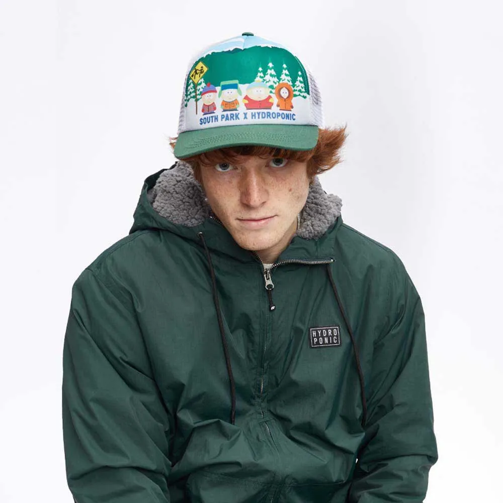 5-Panel-Mesh-Snapback-Cap aus der South Park X Hydroponic Official Collaboration mit tiefem Schnitt und einem speziellen South Park-Digitaldruck auf dem Schirm und den Frontpanels.