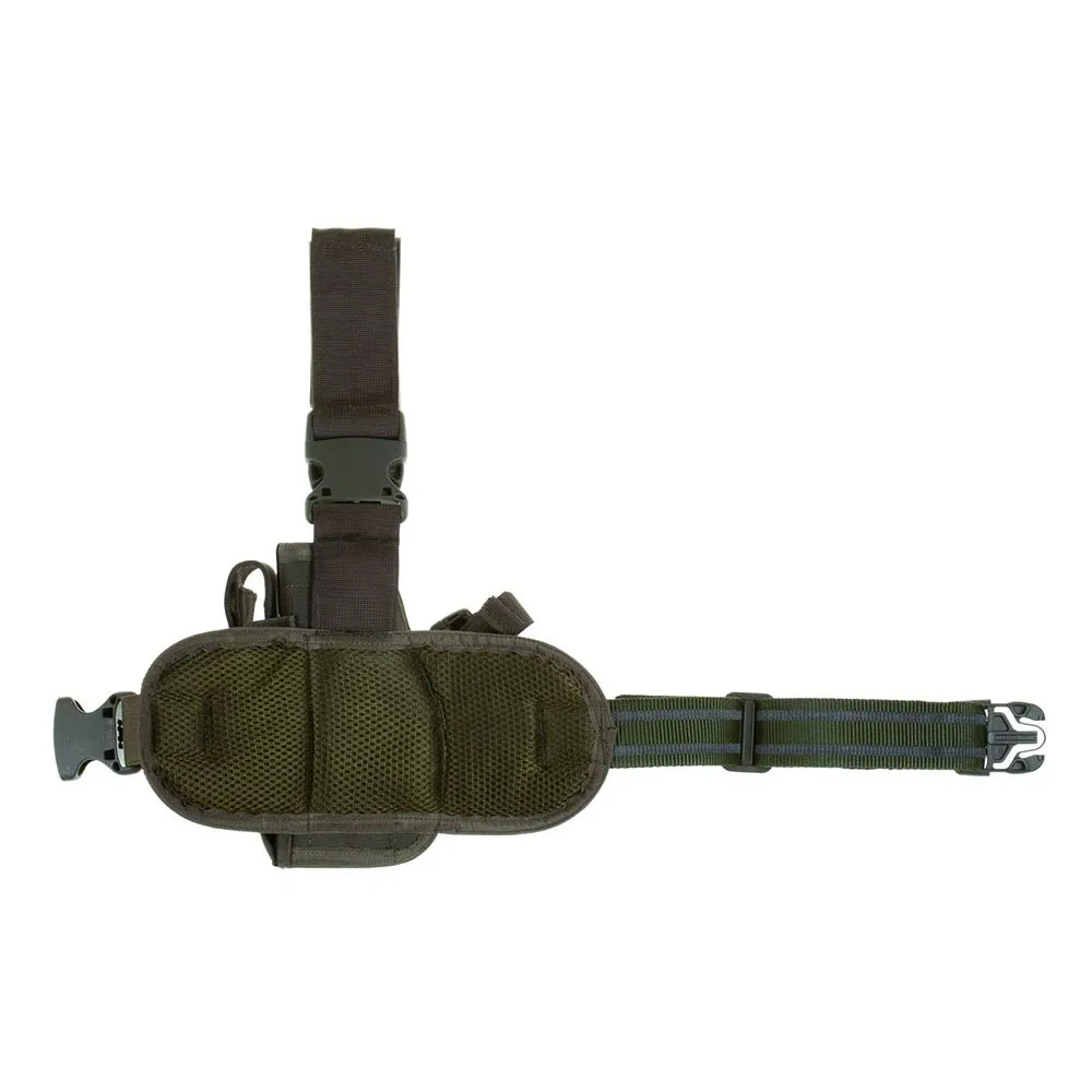Universelles Dropleg-Holster, passend für eine Vielzahl von mittelgroßen Pistolen wie z.B. Glock 17 oder Beretta 92. Es ist ausgestattet mit integriertem Magazinhalter und integriertem Beinpanel, das mit einem Gürtelclip und drei rutschfesten, elastischen Riemen am Oberschenkel befestigt wird.