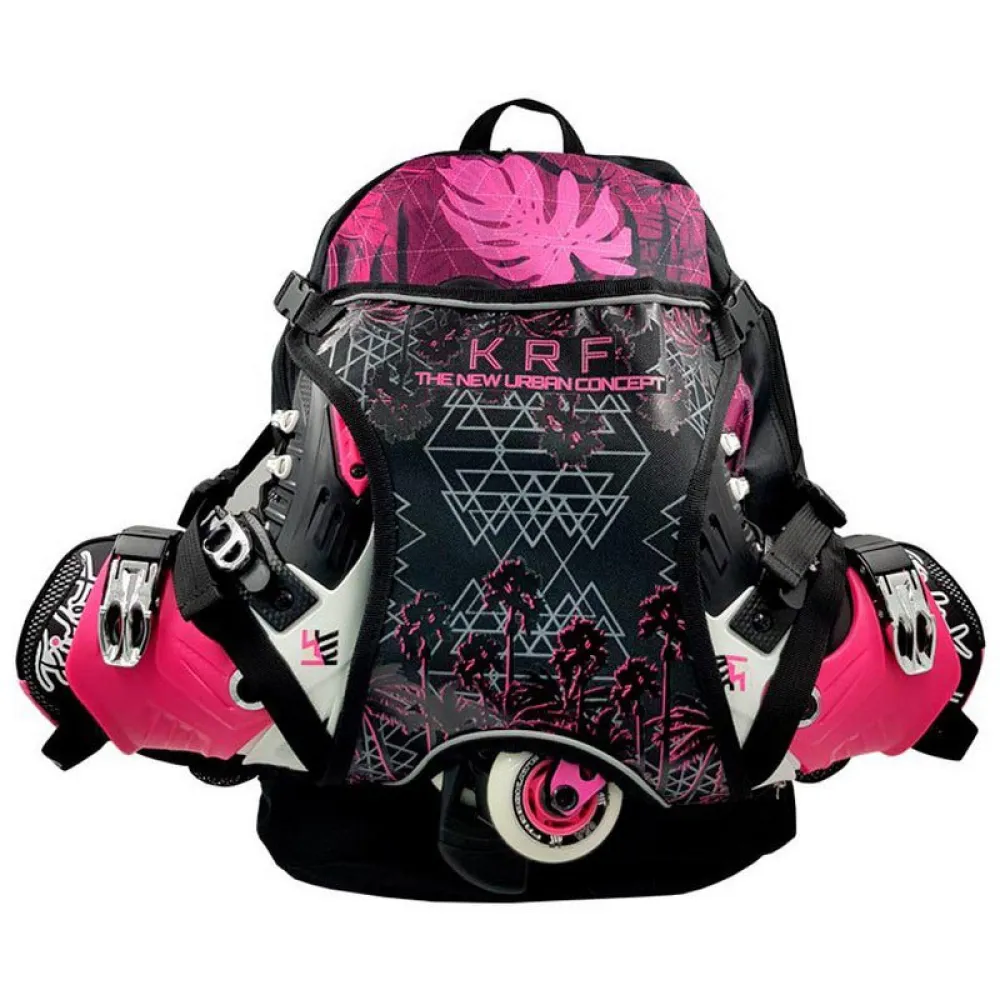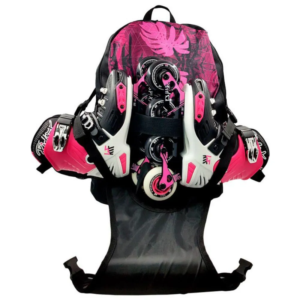 Rucksack zum bequemen Tragen von Inline-Skates, sei es Fitness oder Freeskate. Mit einem Außenfach für die Schlittschuhe, das an den Seiten mit Nylonbändern und einem zentralen Nylonstreifen befestigt ist, um die Schlittschuhe zu halten. Darin befindet sich eine Netztasche, um den Schutz zu gewährleisten. Großes Hauptfach, in dem Sie Ihre Sachen aufbewahren können, mit Taschen für kleine Dinge. Es enthält im oberen Teil eine Tasche für das Handy, sie werden für die Kopfhörer ausgegeben. Gepolsterte Streifen zum Aufhängen am Rücken und Nylonriemen zum Halten vorne und zum bequemen Tragen des Rucksacks mit Ihren Schlittschuhen ohne Bewegung. Mit Nylonhandgriff. Seitentaschen aus Mesh.