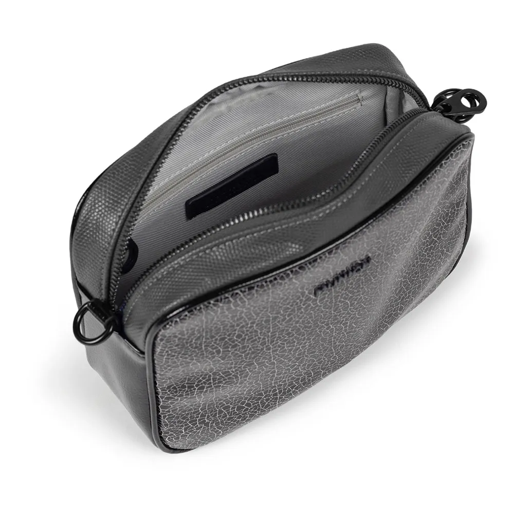 Umhängetasche aus einer Mischung von geprägten und bedruckten Kunstledern. Fach auf der Rückseite. Abnehmbare und verstellbare Schultergurte. Innenraum mit Reißverschlusstasche.
