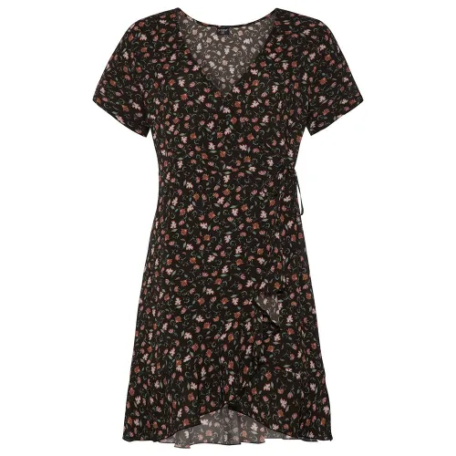 Es gibt ein Wickeldetail an der Vorderseite des Kleides und eine fabelhafte Rüsche verläuft entlang der Stoffkante.