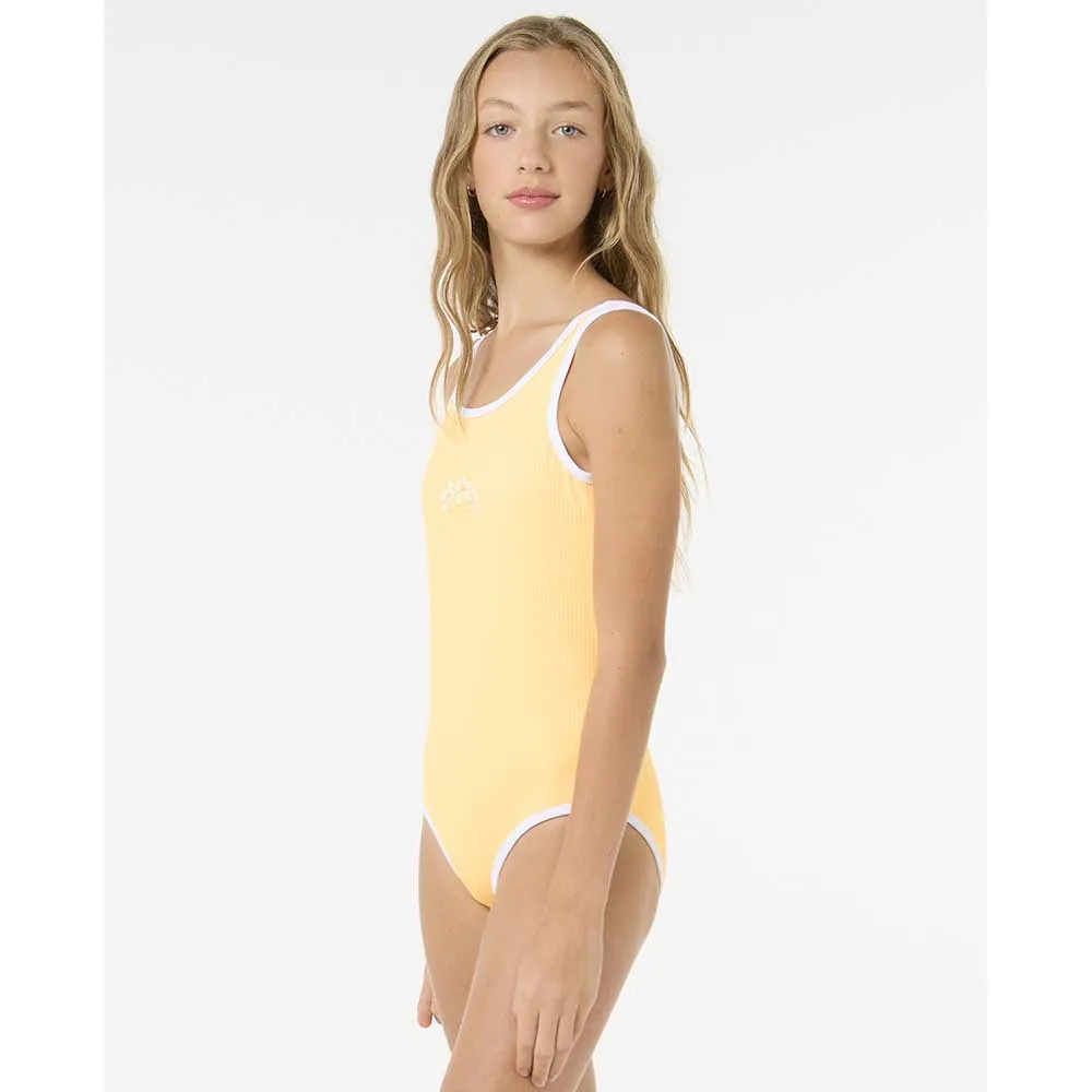 Das Bliss One Piece Girl hat ein klassisches Design und eine sonnige Farbe. Hergestellt aus dehnbarem und bequemem Stoff, perfekt für Strand- oder Pooltage. Die weiße Verzierung und die floralen Details verleihen einen eleganten und verspielten Touch.