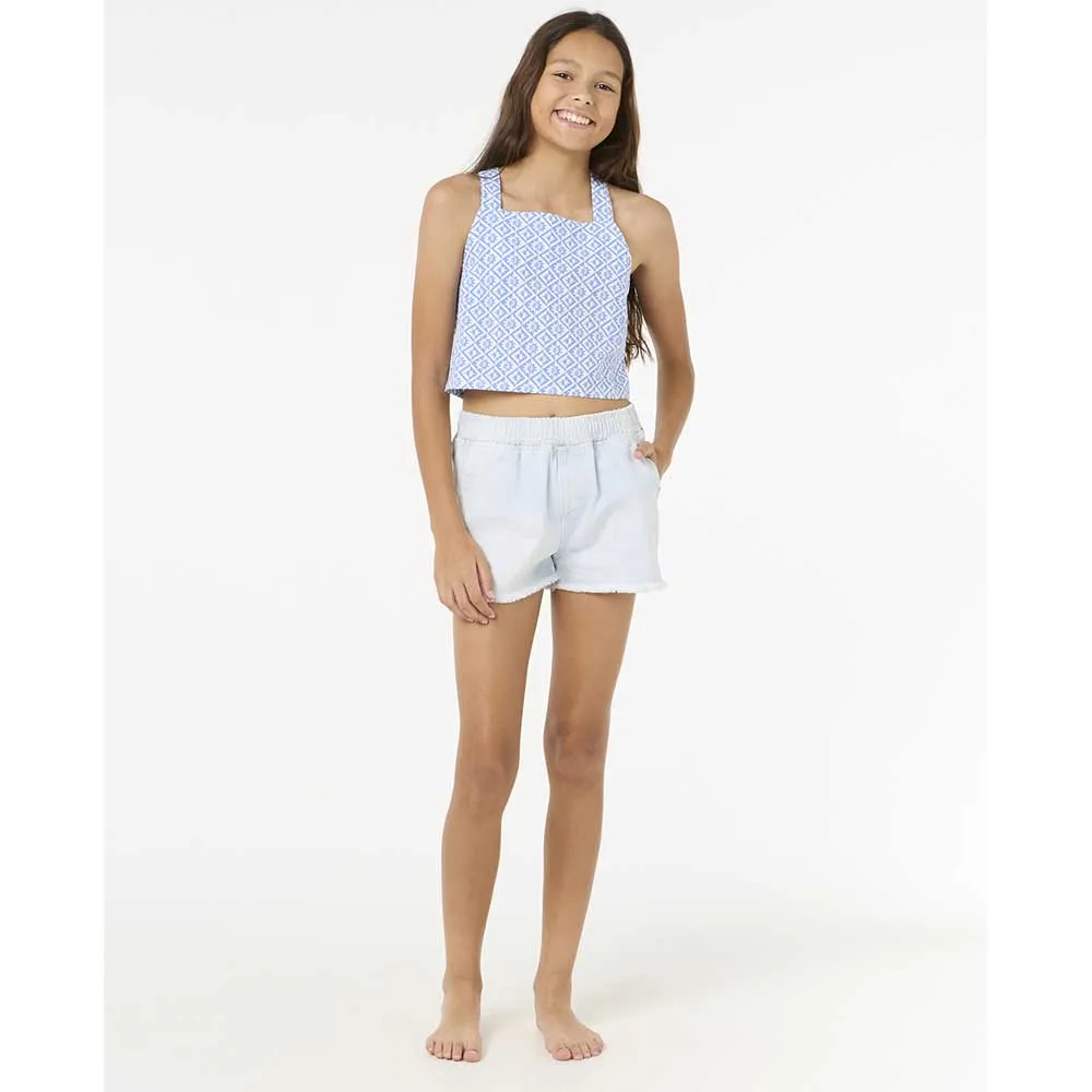 Das Blissy Woven Top für Mädchen kombiniert Baumwoll-Leinen-Gewebe mit einer Standardpassform. Mit verstellbaren Trägern, Kokosnussknopf und durchgehendem Yardage-Print bietet dieses Top einen stylischen und umweltfreundlichen Look für alltägliche Abenteuer.