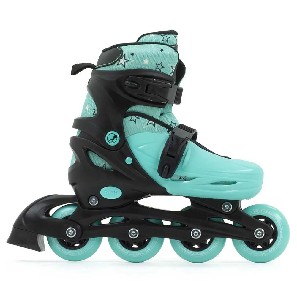 Plasma, erhältlich in 4 Farben, ist ein in der Freizeit verstellbarer Inline-Skate, der perfekt für Anfänger geeignet ist. Sein Design ist hell und universell mit einem sich wiederholenden Muster von Sternen.