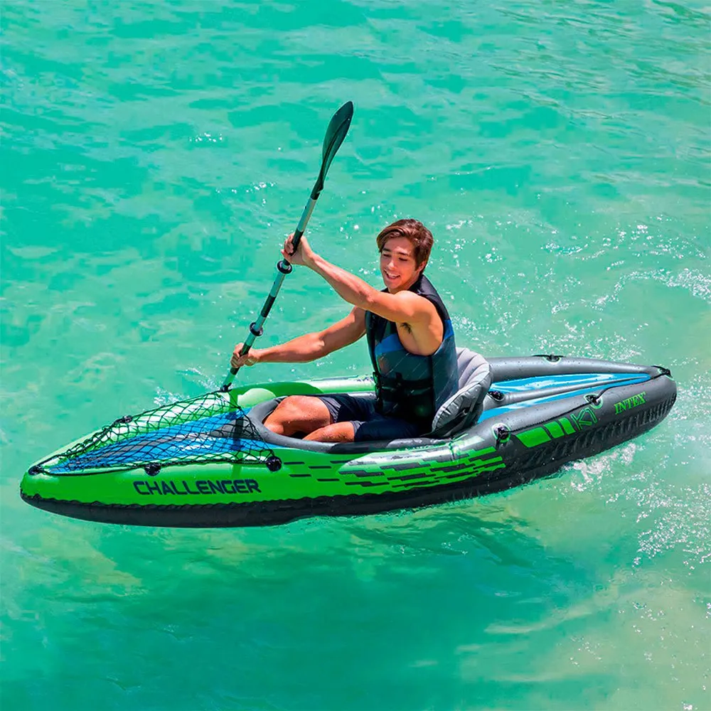 Intex inflatable Challenger K1 kayak, made for one person (maximum 100 kg), measuring 274x76x33 cm.